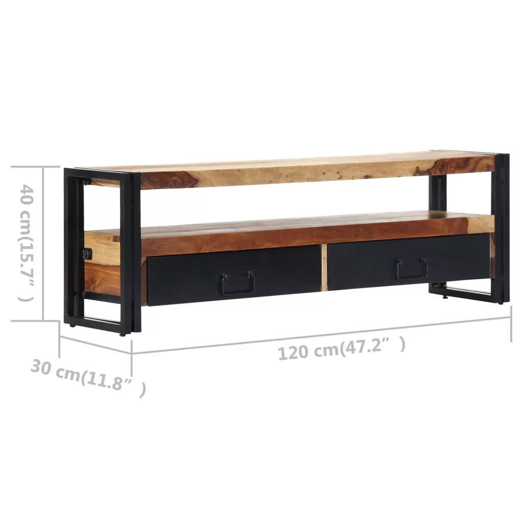 Ez a modern stílusú TV-szekrény tömör akácfából készült, így időtálló kiegészítője lesz otthonának. A kelet-indiai rózsafa, más néven akácia vagy paliszander, egy trópusi keményfa, mely gazdag erezetéről ismert. A megmunkálás minden lépése a legnagyobb gondossággal történt, legyen szó akár a csiszolásról, a festésről vagy a lakkozásról. Az erős acélváznak köszönhetően a TV-állvány rendkívül stabil és tartós. Két fiókkal és egy nyitott tárolórekesszel lett ellátva, ahol apróbb tárgyait, valamint multimédiás eszközeit, játékkonzoljait és magazinjait tárolhatja.