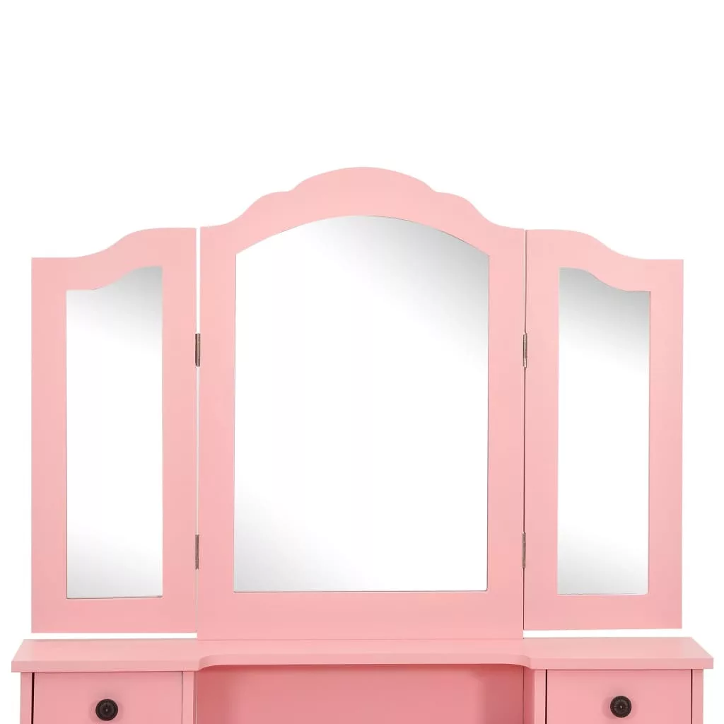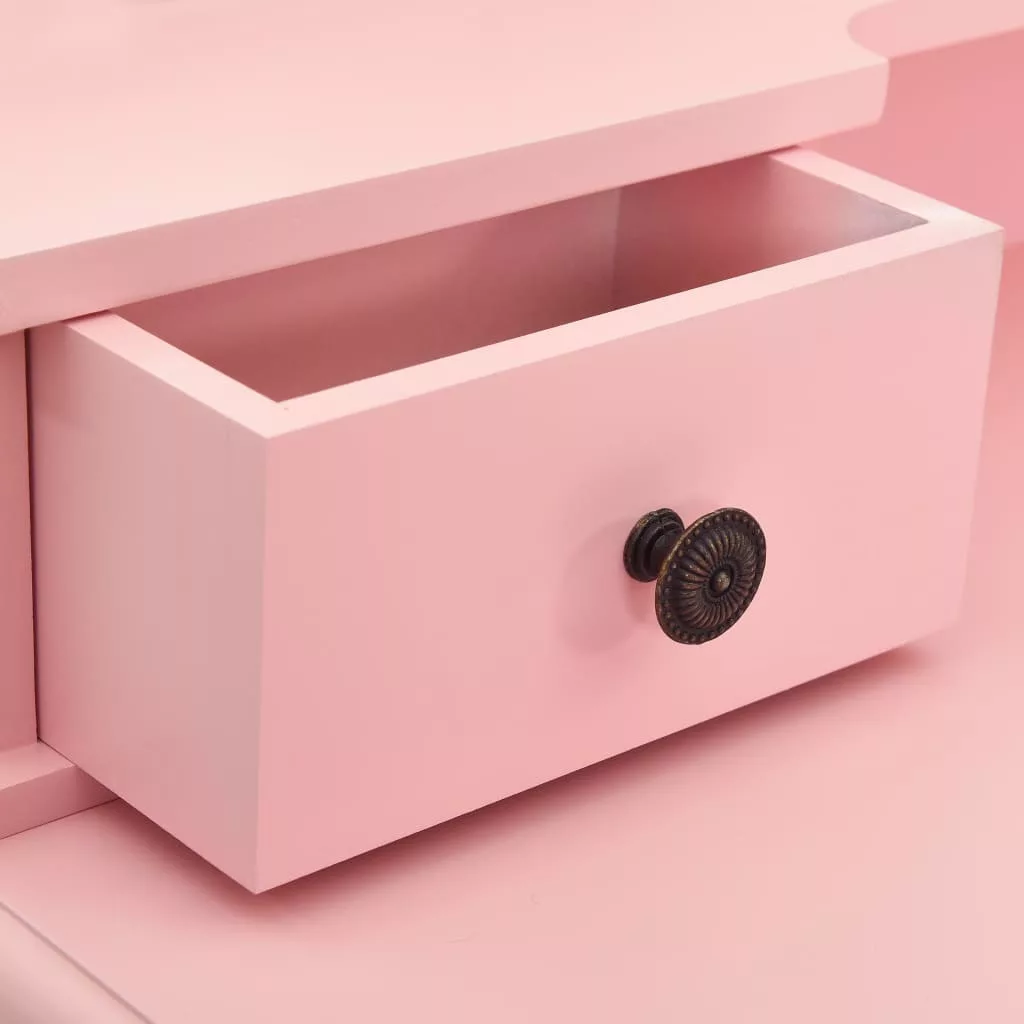 Ez a válogatott császárfából készült fésülködőasztal egyedülálló formával és négy luxus stílusban karos lábbal rendelkezik. A három különböző méretű fiók tökéletes méretű helyet biztosít a sminkkészlet és az ékszerek tárolására. Az asztallapon parfümöt vagy más díszeket helyezhet el. A mellékelt szék háttámla nélküli párnázott üléssel és az asztalhoz illő fa lábakkal rendelkezik. Emellett a beépített tükör kiemeli az asztal gyönyörű formáját, és modern hangulatot áraszt.