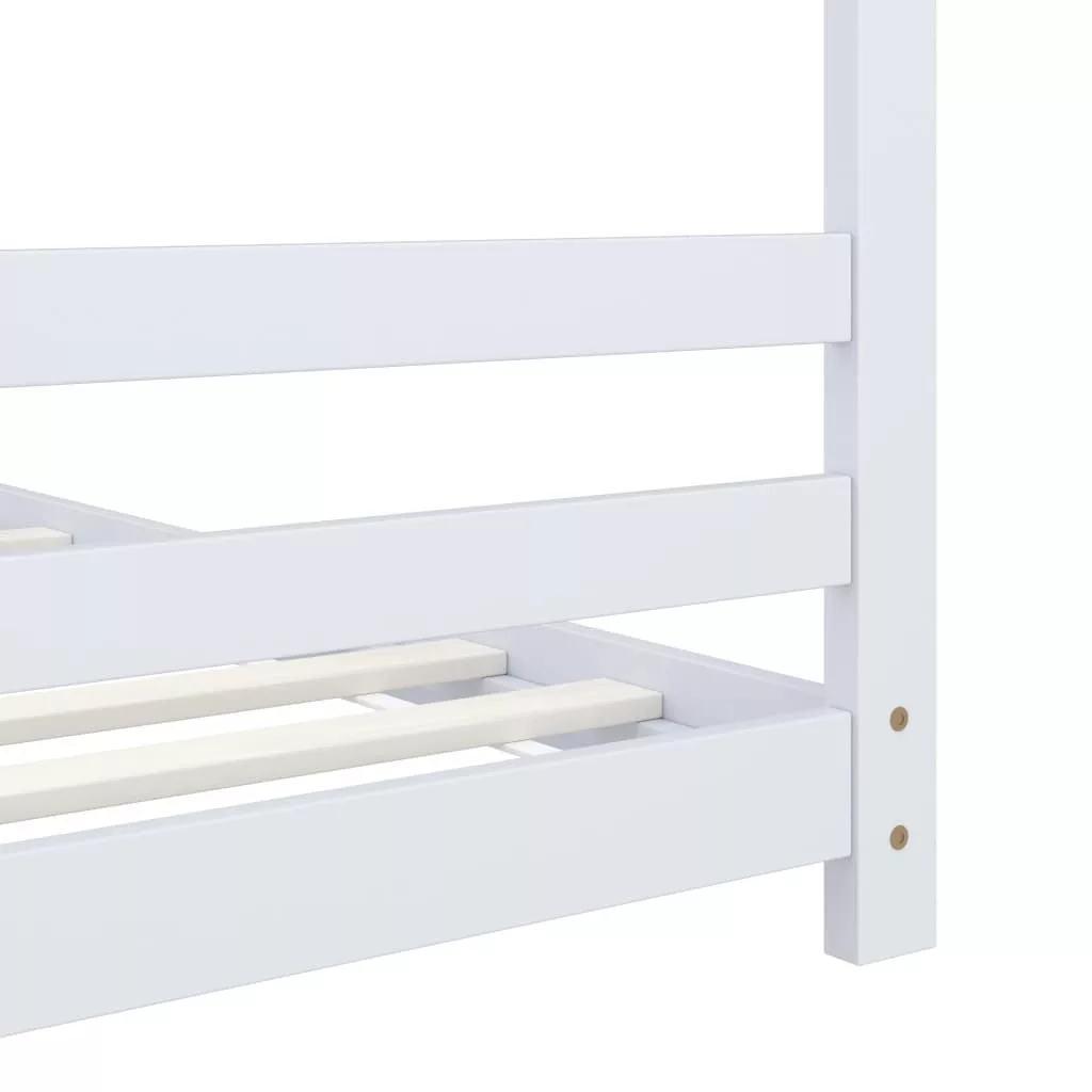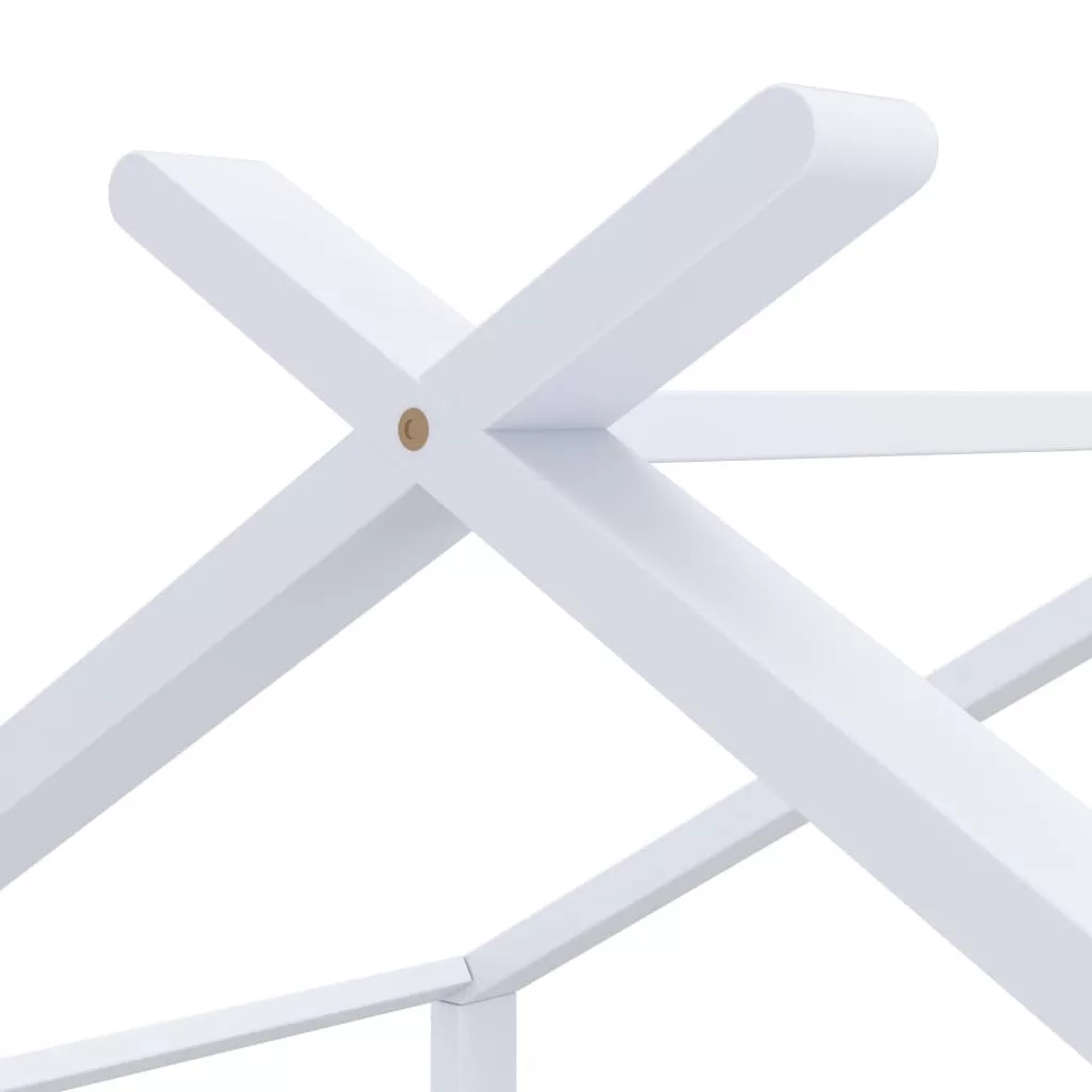 Az ügyesen kialakított, faház formájú keretre felfüggesztheti az ágyfüggönyöket, privát teret biztosítva ezzel gyermekének. Ez a fa ágy tökéletesen használható olvasósarokként vagy játszóházként is. Az ágykeret tömör fenyőfából készült, így rendkívül masszív és tartós. Az erős lécek megfelelő támaszt biztosítanak. Ez az ágykeret 70 x 140 cm méretű matracokhoz illik.
