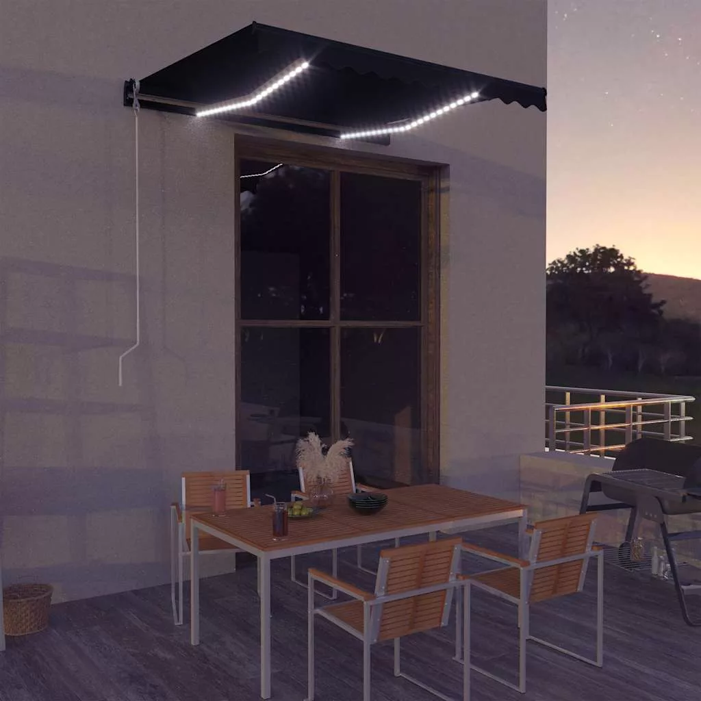 A rozsdaálló, porszórt alumínium vázzal és könnyű, mégis szilárd szerkezettel rendelkező napellenző egy bizonyos mértékig ellenáll a szélnek. Az összecsukható karos napellenző szövete nagy sűrűségű, poliuretán bevonatú poliészterből készült, amely víz-, UV- és fakulásálló. A szög és a magasság az Ön igényei szerint állítható. A napellenző a hosszú hajtókarral zökkenőmentesen nyitható és visszahúzható. Emellett a karhoz erősített napelemes LED-lámpák éjjel energiahatékony világítást biztosítanak.