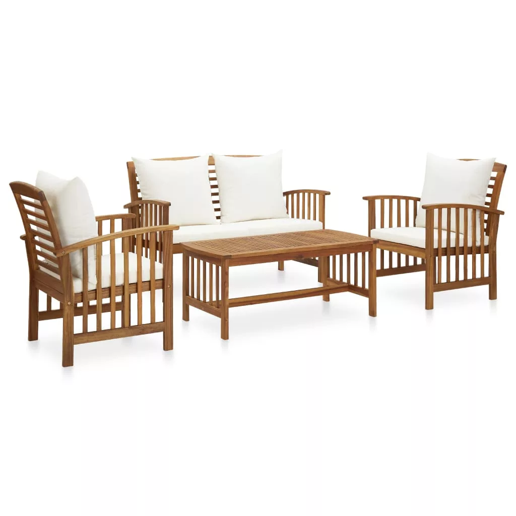 A kerti bútorszett tömör, olajbevonatos akácfából készült, így stabil és tartós. A vastag hát- és ülőpárnák lágy ülőélményt kínálnak. A tömör, lécezett fa asztallapnak köszönhetően a dohányzóasztal megfelelő helyet kínál a ropogtatnivalóknak, gyümölcskosaraknak, dísztárgyaknak és egyéb kellékeknek. Az enyhén ívelt hát- és kartámaszok növelik a pad és a szék kényelmét ülés közben.