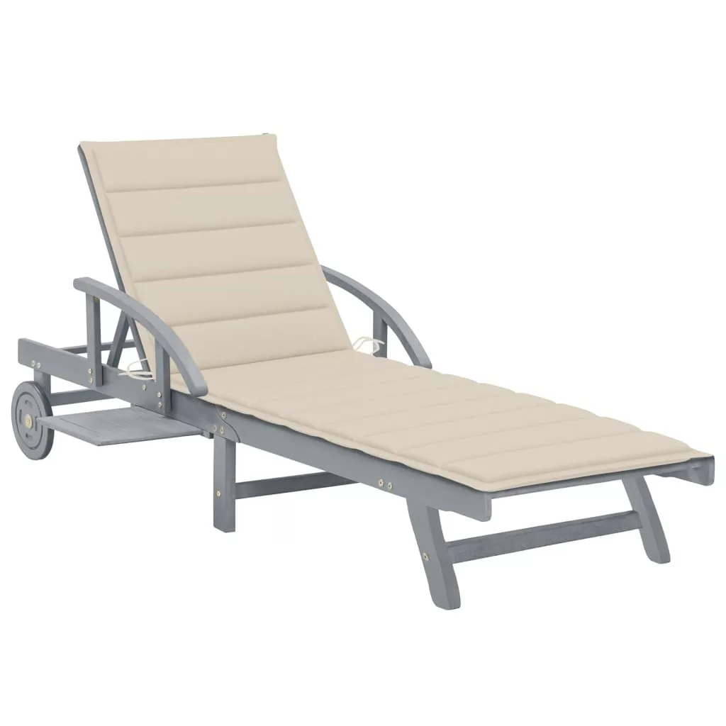 Ez a kültéri napozóágy szürke koptatott felületű tömör akácfából készült, így masszív és stabil. A háttámla és a lábtartó állítható, és a nyugágyat a kívánt helyzetben rögzítheti. Ez a kerti napágy a 2 kerekével könnyen mozgatható a ház körül. A napágy kényelmes kihúzható asztallal rendelkezik, amelyre telefonját, napszemüvegét, italát és egyéb apróságokat helyezhet. A párna extra kényelmet biztosít pihenés közben. Minden párna két kötélszettel van ellátva, hogy szorosan rögzíthesse őket a napozóágyon.