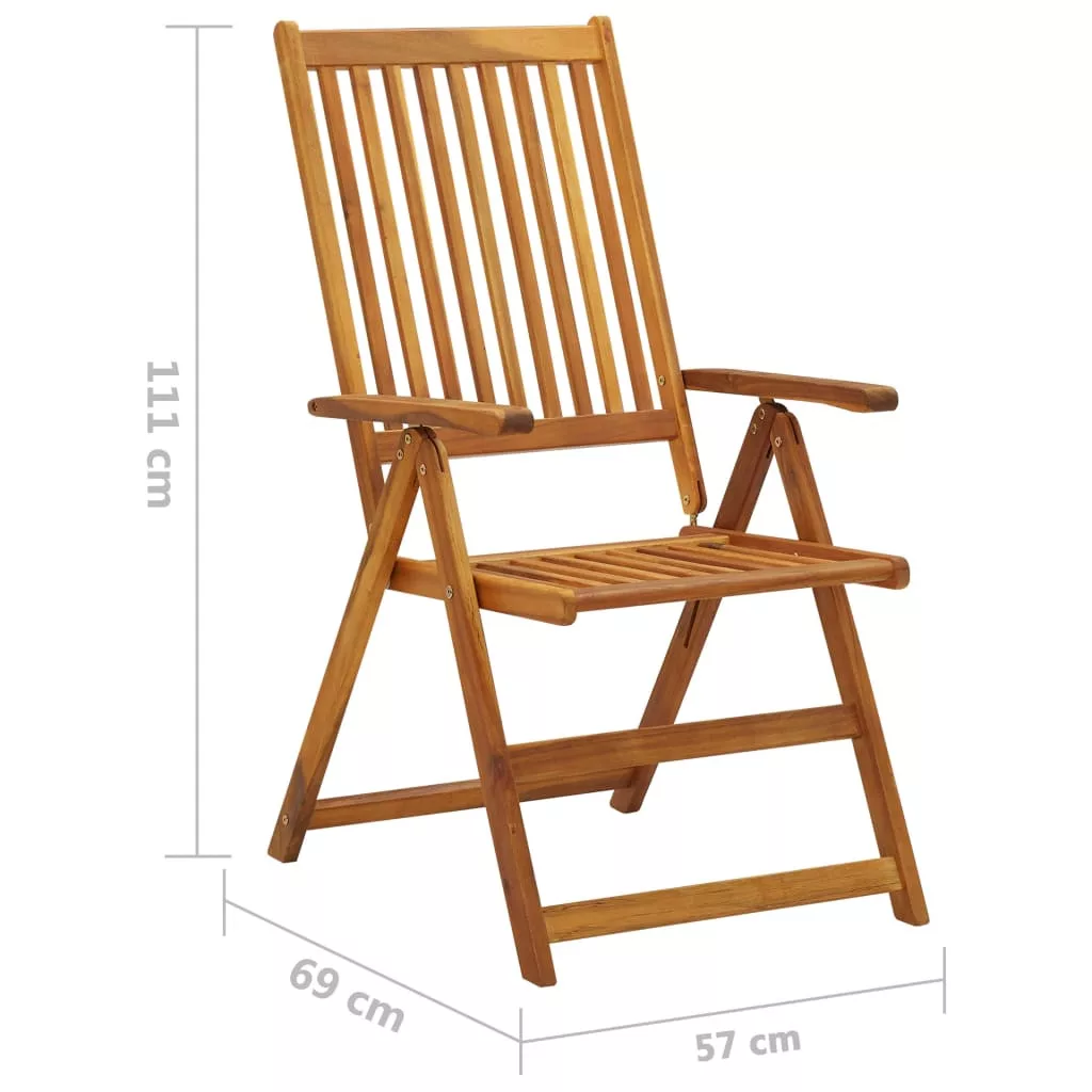 Ezek a kültéri székek olajbevonatú, tömör akácfából készültek: egy sűrű erezetű keményfából. A tömör akácfa elég erős, hogy elbírja a rá nehezedő súlyt, valamint a kopásnak is ellenáll. Az olajos felületkezelésnek köszönhetően a székek nedves ruhával könnyen tisztíthatóak. Emellett a karosszékek háttámlája 5 különféle pozícióba állítható, hogy Ön mindig megtalálhassa közülük a legkellemesebbet. Ráadásul a mellékelt párnák további kényelmet nyújtanak pihenés vagy étkezés közben. Minden párna egy-egy elasztikus pánttal és két-két kötözővel van ellátva, melyekkel szorosan a székekhez rögzíthetőek.