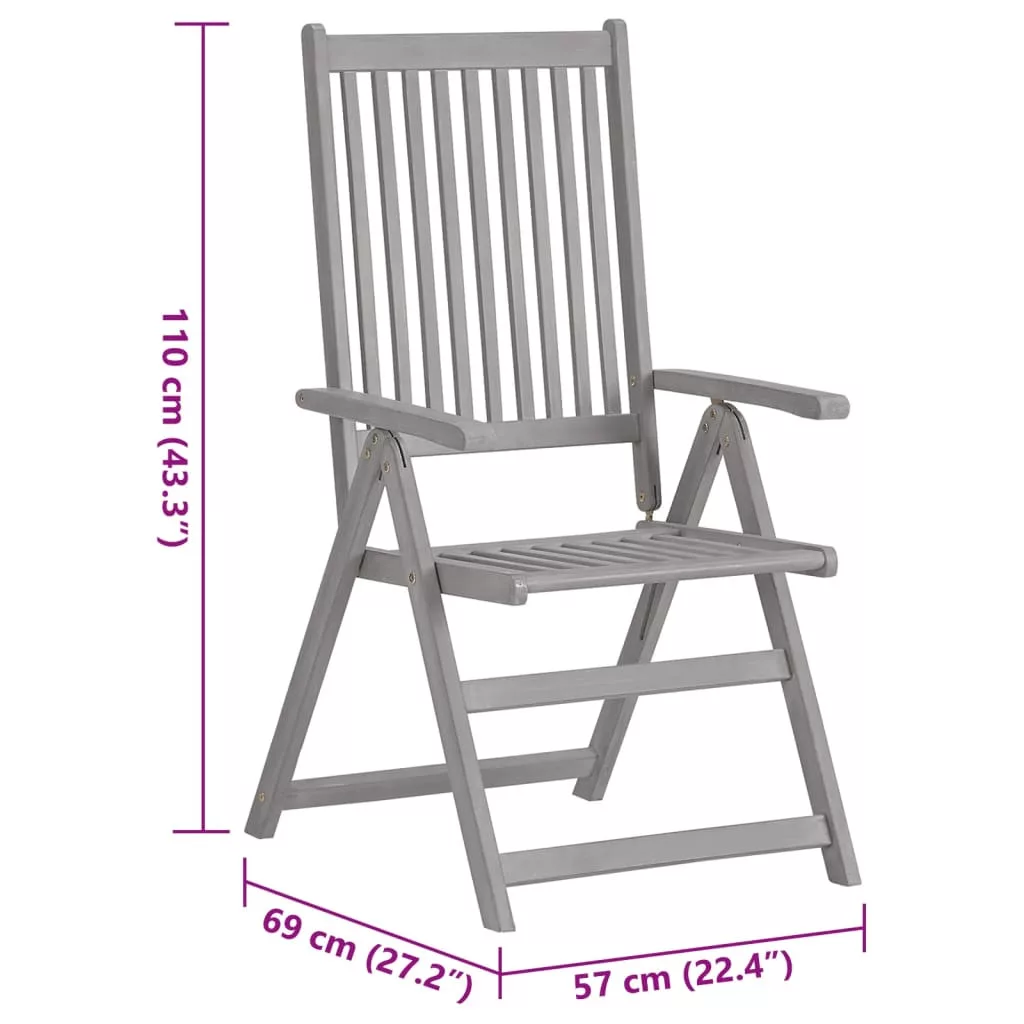 Ezek a karosszékek tömör akácfából készültek, amely egy sűrű erezetű keményfa, valamint szürke felületet kapott. Ezek a gyönyörű kialakítású kültéri székek stabilak, tartósak és figyelemfelkeltőek. A szék háttámlája 5-féle pozícióba dönthető, így mindig a legkényelmesebb helyzetbe állíthatja, saját igényeinek megfelelően. Sőt, a mellékelt párnák további kényelmet nyújtanak pihenés vagy étkezés közben. A párnák egy-egy elasztikus pánttal és két-két kötözővel lettek ellátva, melyekkel a székekhez rögzíthetőek. Ezek a székek kiválóan alkalmasak a családjával töltött étkezésekhez vagy egyszerűen csak élvezni a jó időt a kertben.