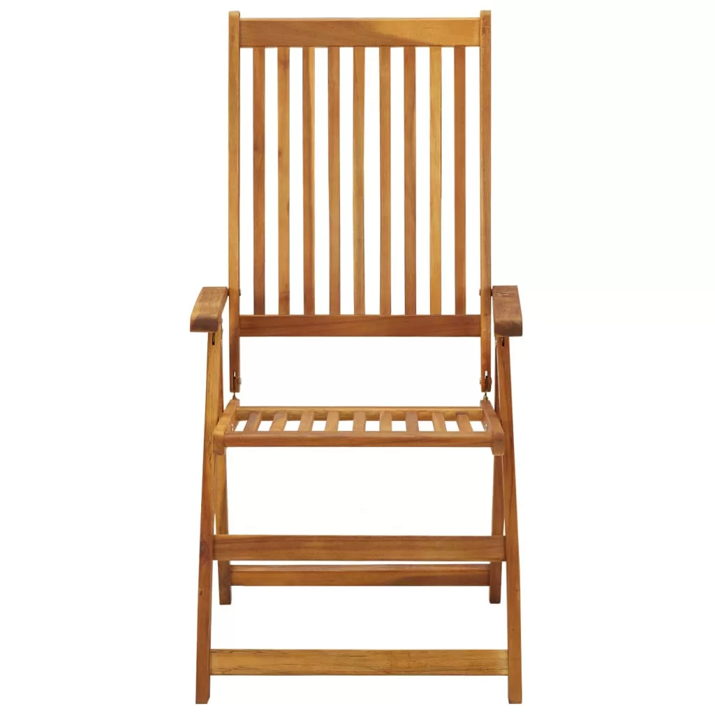 Az összecsukható szék tömör akácfából, egy trópusi keményfából készült, így stabil és tartós. Az olajjal kezelt felület nedves ruhával könnyen tisztítható. Az étkezőszék 5 helyzetbe állítható, optimális kényelmet biztosítva Önnek. Használaton kívül a helytakarékosság érdekében összecsukható. A mellékelt párnák extra kényelmet nyújtanak.