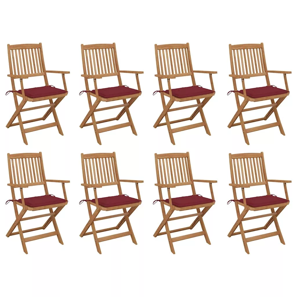 Az étkezőszékek minőségi akácfából, egy trópusi keményfából készültek, mely időjárásálló és rendkívül strapabíró, éveken keresztül használható. Olajjal kezelt felületének köszönhetően egy nedves ronggyal könnyedén tisztítható. A székek használaton kívül a helytakarékosság érdekében összecsukhatóak. Ráadásul a mellékelt párnák extra kényelmet nyújtanak. Minden párna 2 kötözővel van ellátva, melyekkel szorosan a székekhez rögzíthetőek.