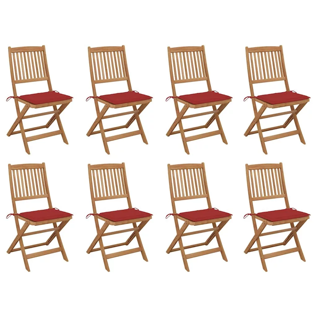Az étkezőszékek minőségi akácfából, egy trópusi keményfából készültek, mely időjárásálló és rendkívül strapabíró, éveken keresztül használható. Olajjal kezelt felületének köszönhetően egy nedves ronggyal könnyedén tisztítható. A székek használaton kívül a helytakarékosság érdekében összecsukhatóak. Ráadásul a mellékelt párnák extra kényelmet nyújtanak. Minden párna 2 kötözővel van ellátva, melyekkel szorosan a székekhez rögzíthetőek.
