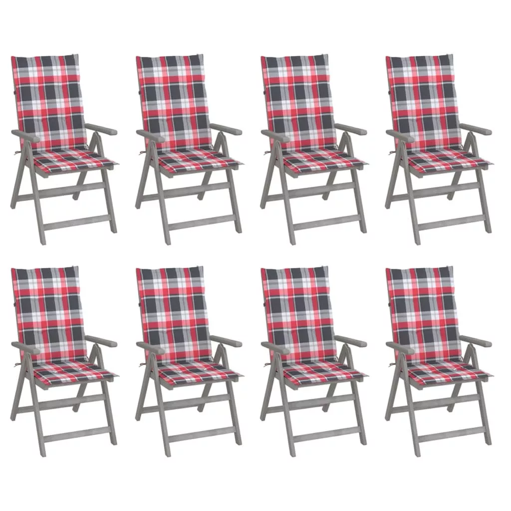 Ezek a karosszékek tömör akácfából készültek, amely egy sűrű erezetű keményfa, valamint szürke felületet kapott. Ezek a gyönyörű kialakítású kültéri székek stabilak, tartósak és figyelemfelkeltőek. A szék háttámlája 5-féle pozícióba dönthető, így mindig a legkényelmesebb helyzetbe állíthatja, saját igényeinek megfelelően. Ezek a székek kiválóan alkalmasak a családjával töltött étkezésekhez vagy egyszerűen csak élvezni a jó időt a kertben. Ráadásul a mellékelt párnák további kényelmet nyújtanak. Minden párna egy elasztikus pánttal és 2 kötöző található van ellátva, melyekkel szorosan a székekhez erősíthetőek.