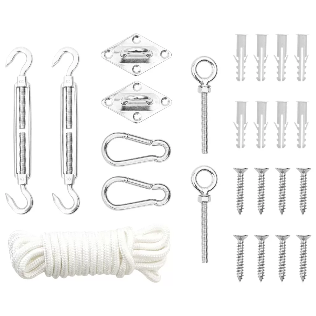 A rozsdamentes acél rögzítőszett könnyen használható, és a legtöbb napvitorlának megfelel. Mihelyt a rögzítőszemek stabil falfelületre kerülnek, a napvitorla a karabinerek segítségével rögzíthető. Ezek rendkívül egyszerűen levehetőek. Ráadásul a kötélfeszítőt állítani is lehet, így a napvitorla könnyen megfeszíthető vagy lazítható.