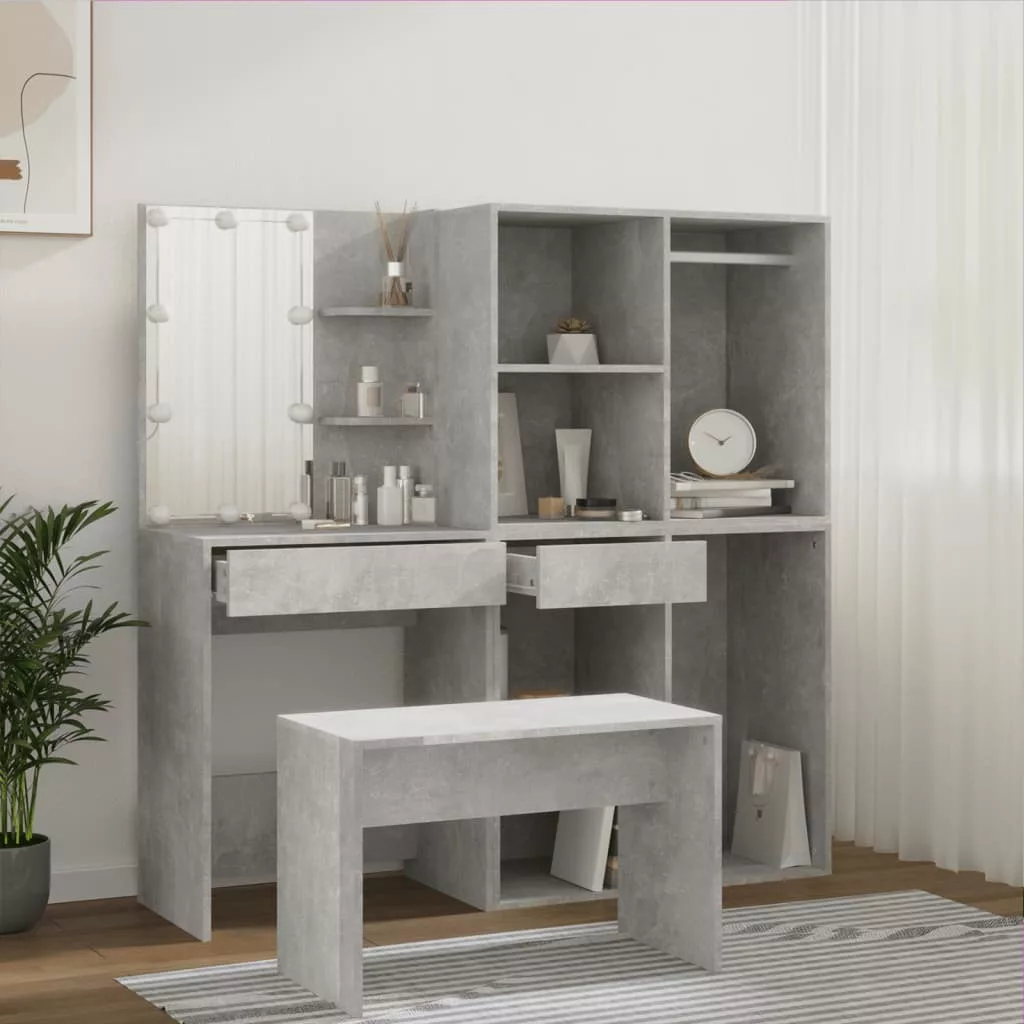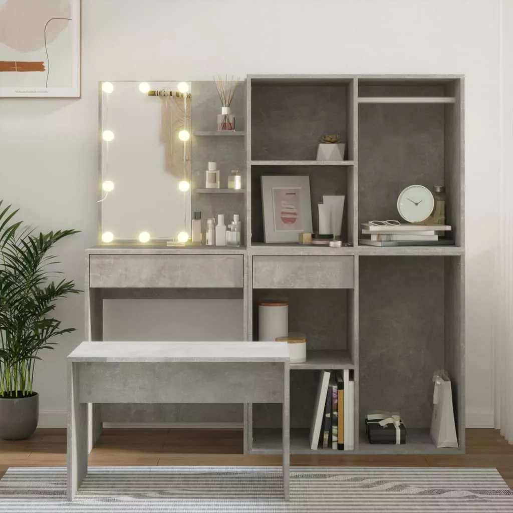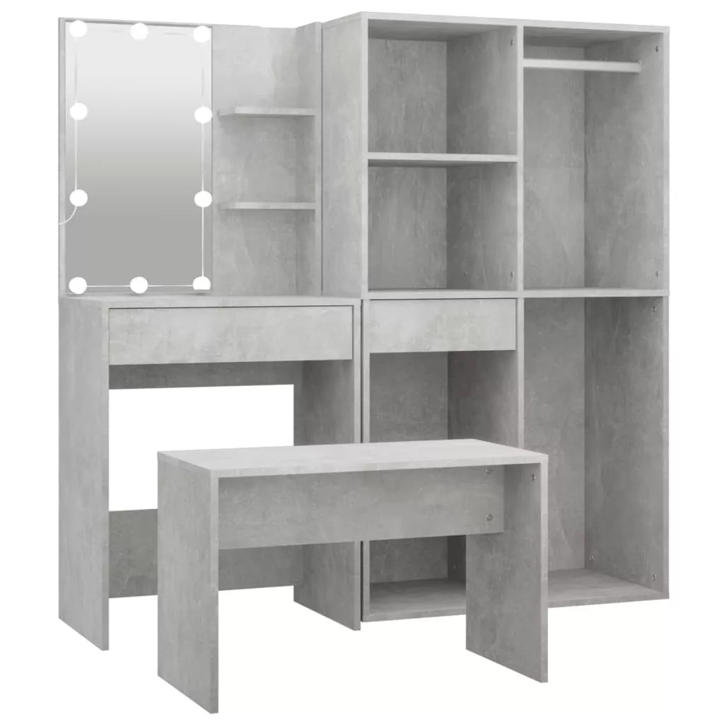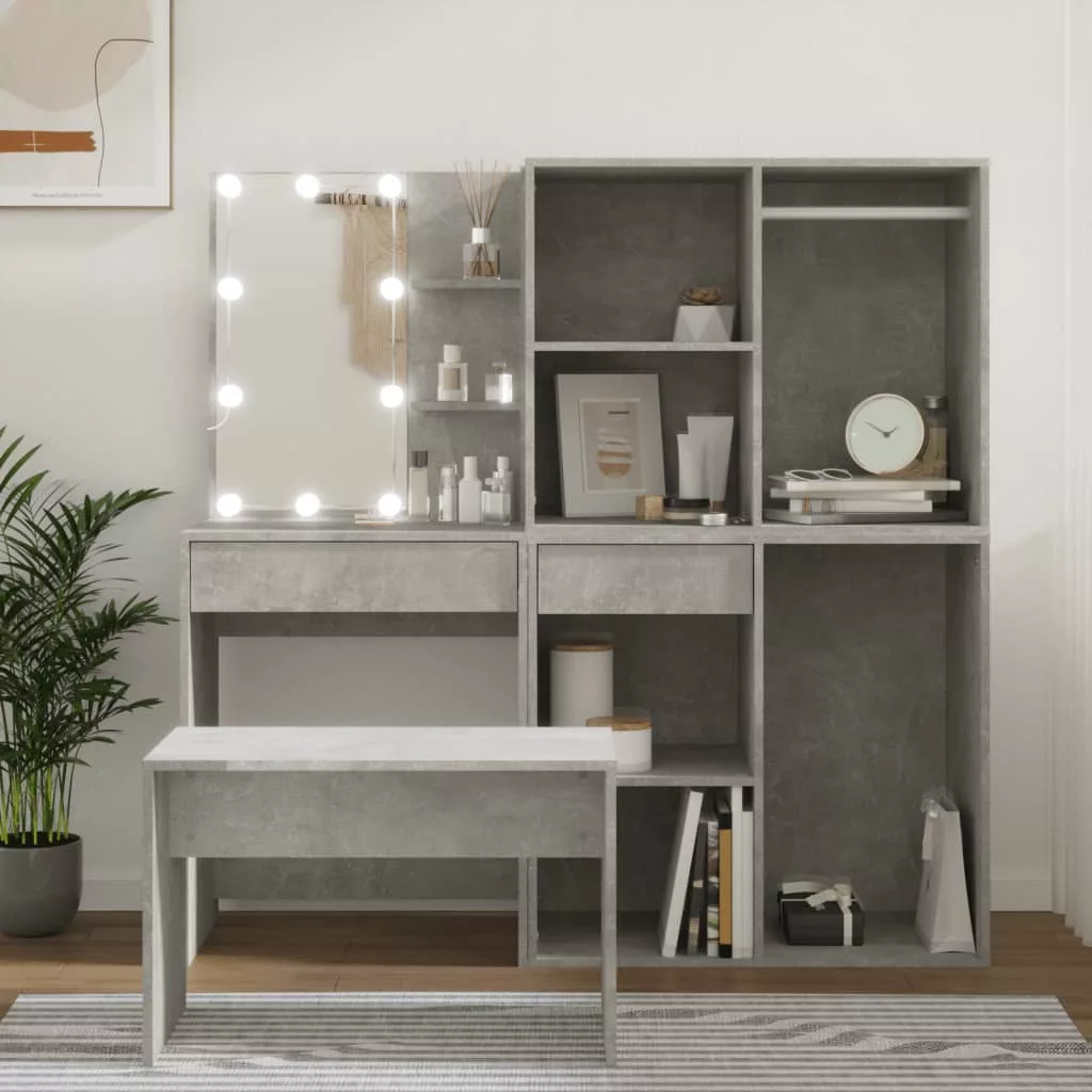 vidaXL betonszürke szerelt fa fésülködőasztal-szett LED-ekkel