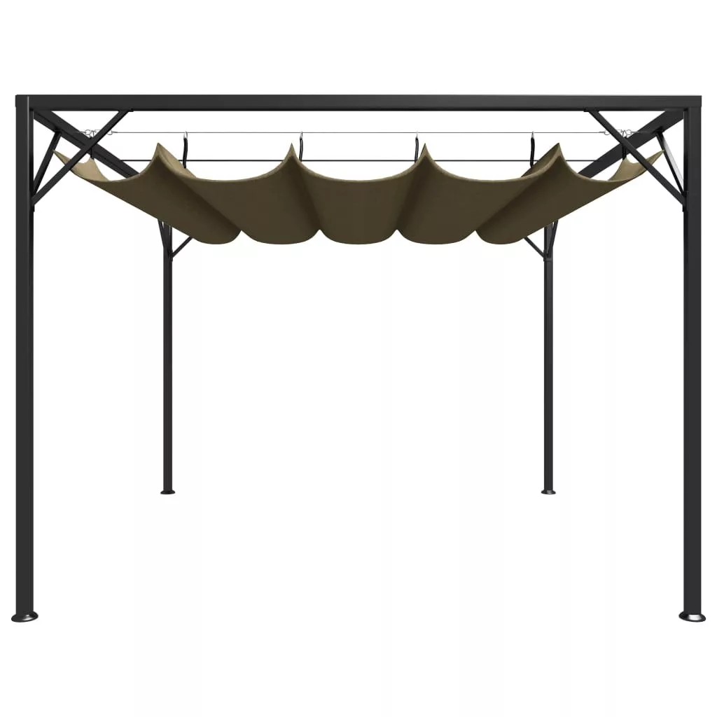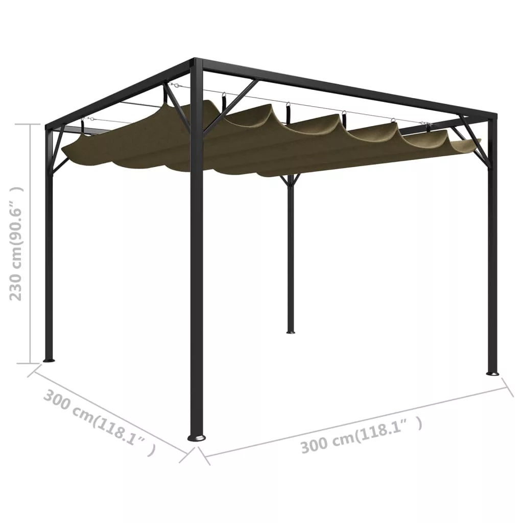 A pavilon mindenfajta időjárás esetén kiváló, a behúzható tető védelmet nyújt a káros UV-sugárzás, és az eső ellen is. Ez a pavilon vízálló, 100%-os poliészterből készült porszórt fémvázzal.