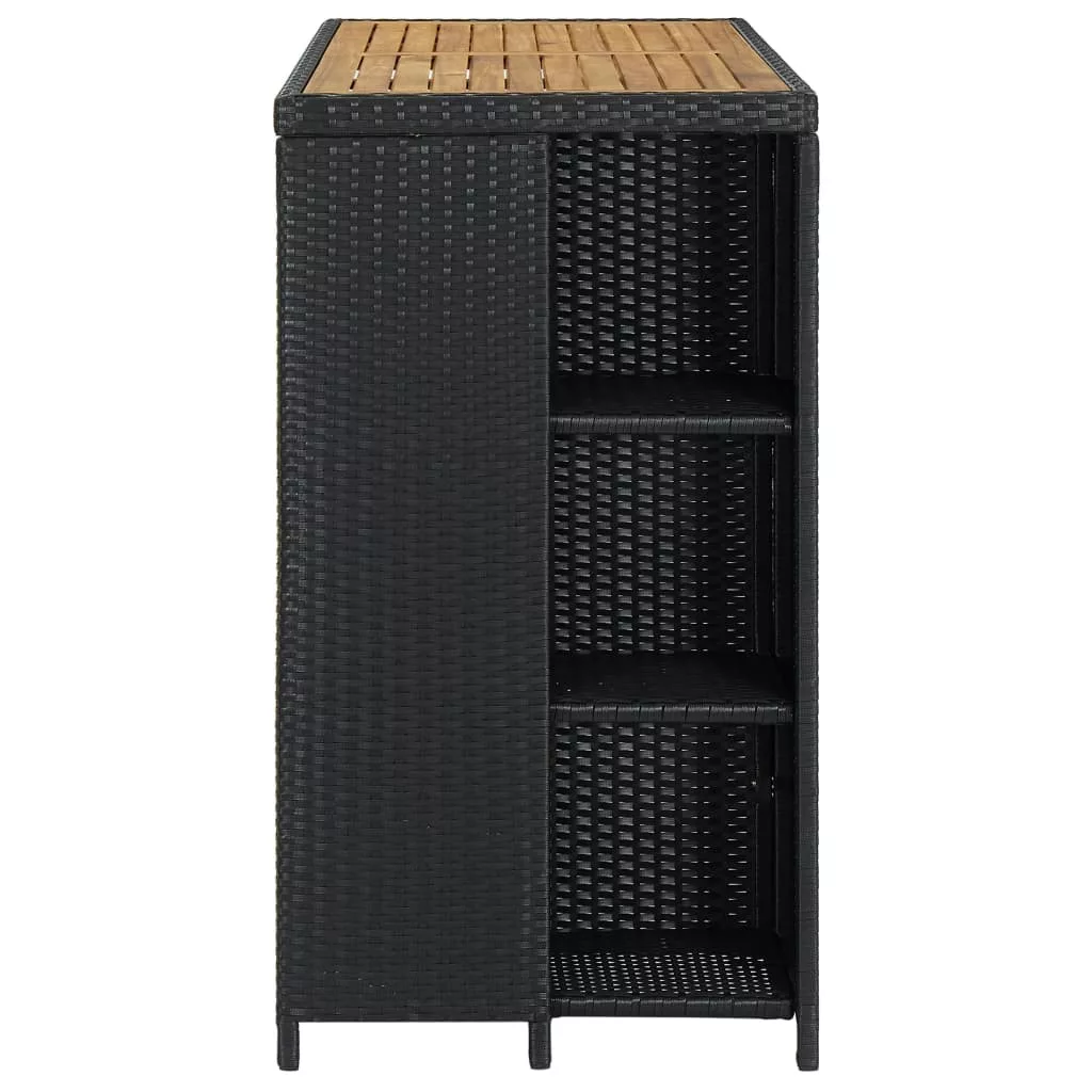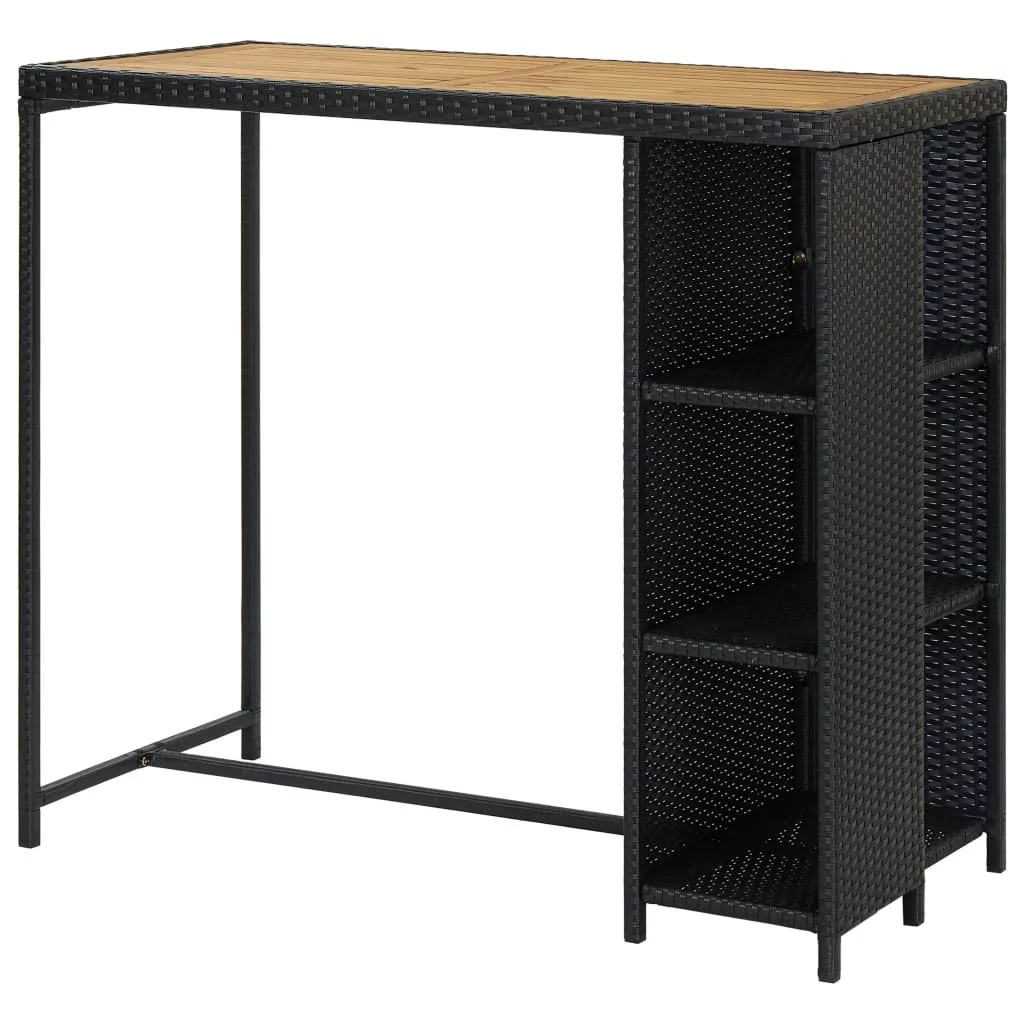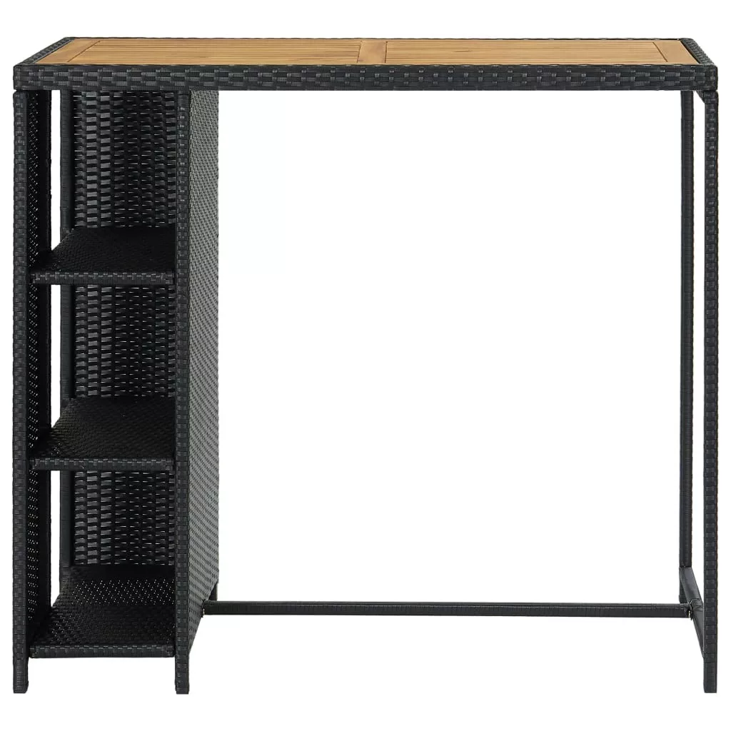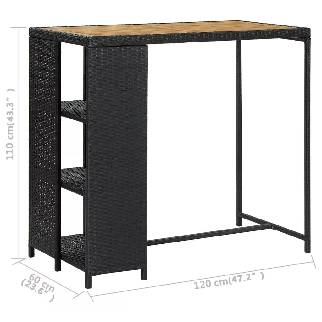 A bisztróasztal PE rattanból készült és fémvázat kapott, így strapabíró és stabil. A masszív asztallap akácfából készült és remekül tárolhatók rajta az italok és a harapnivalók. Az oldalsó tárolópolc 3 szintes és további helyet biztosít holmijai elérhető közelségben történő tárolásához. A könnyű konstrukciónak köszönhetően az étkezőasztal könnyen mozgatható.
