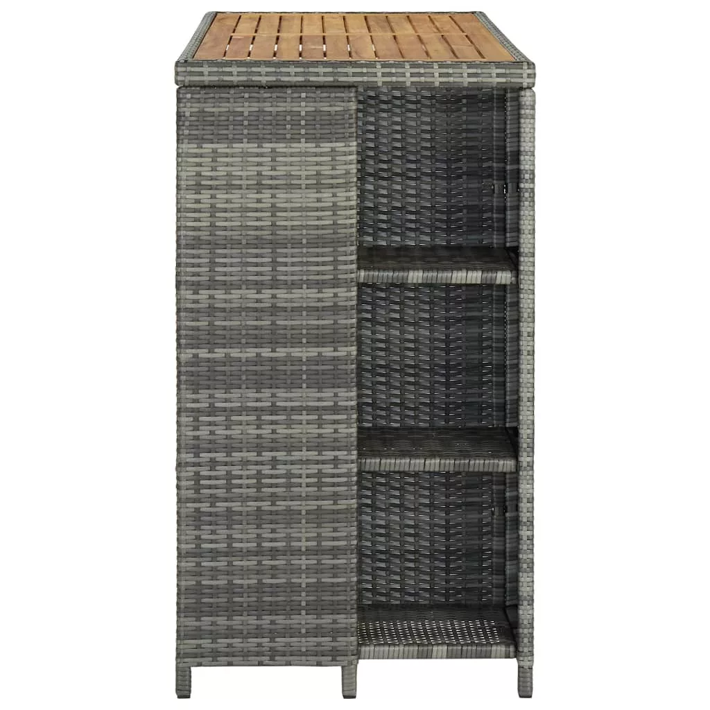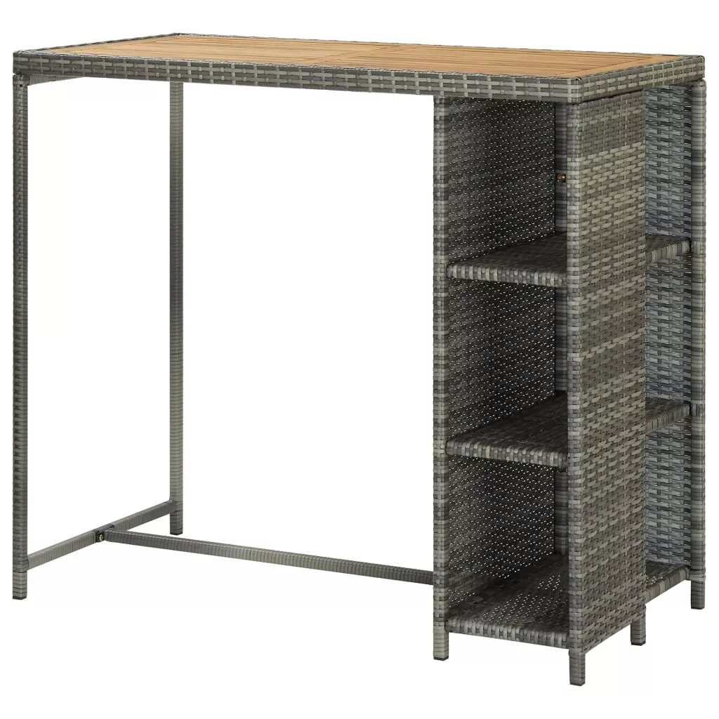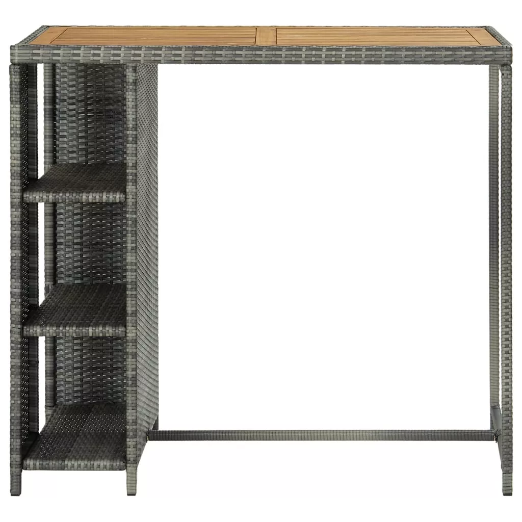 A bisztróasztal PE rattanból készült és fémvázat kapott, így strapabíró és stabil. A masszív asztallap akácfából készült és remekül tárolhatók rajta az italok és a harapnivalók. Az oldalsó tárolópolc 3 szintes és további helyet biztosít holmijai elérhető közelségben történő tárolásához. A könnyű konstrukciónak köszönhetően az étkezőasztal könnyen mozgatható.