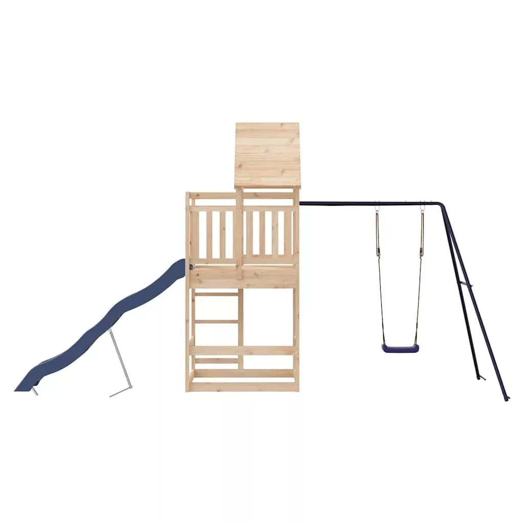 - Multi-aktivitási központ: A fa játszószett 118 cm magas emelvénnyel, valamint hullámos csúszdával, hintaszettel és homokozóval rendelkezik. A kicsik barátaikat is meghívhatják játszani.