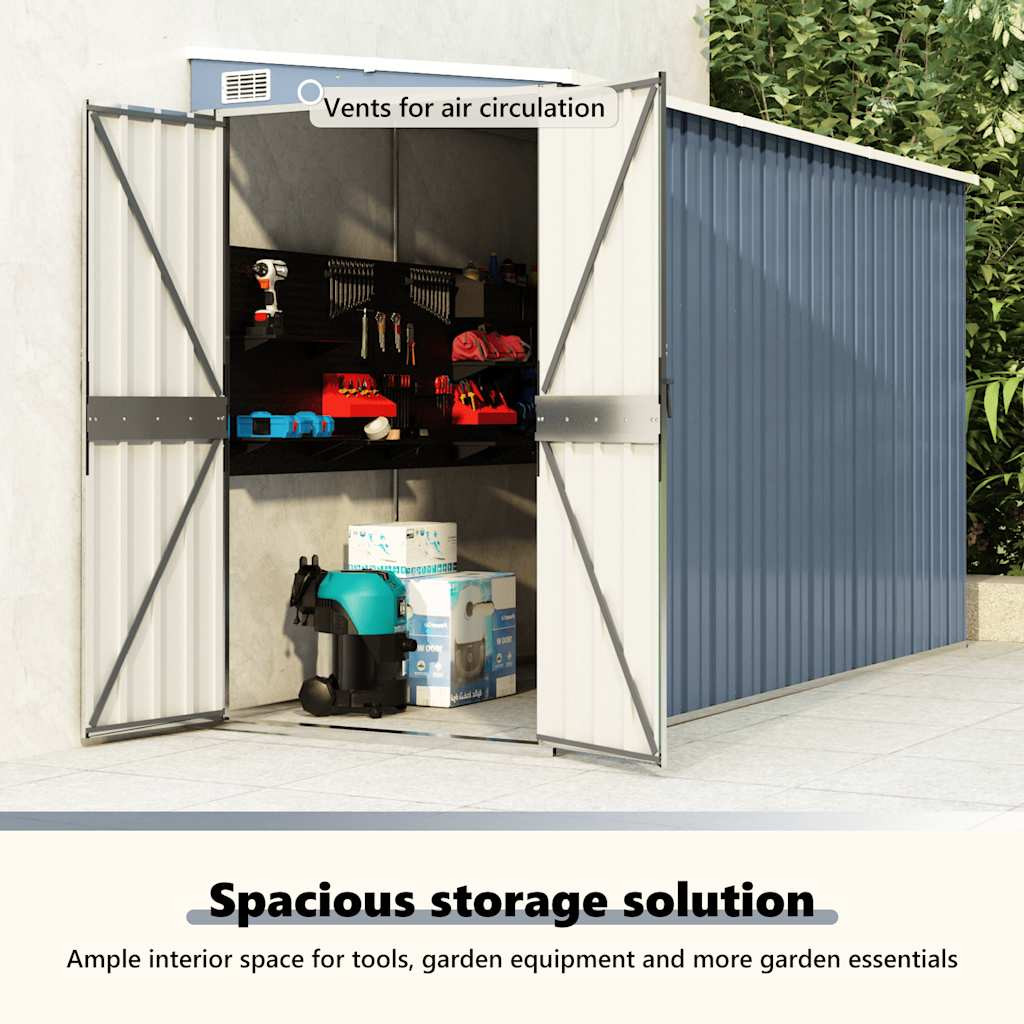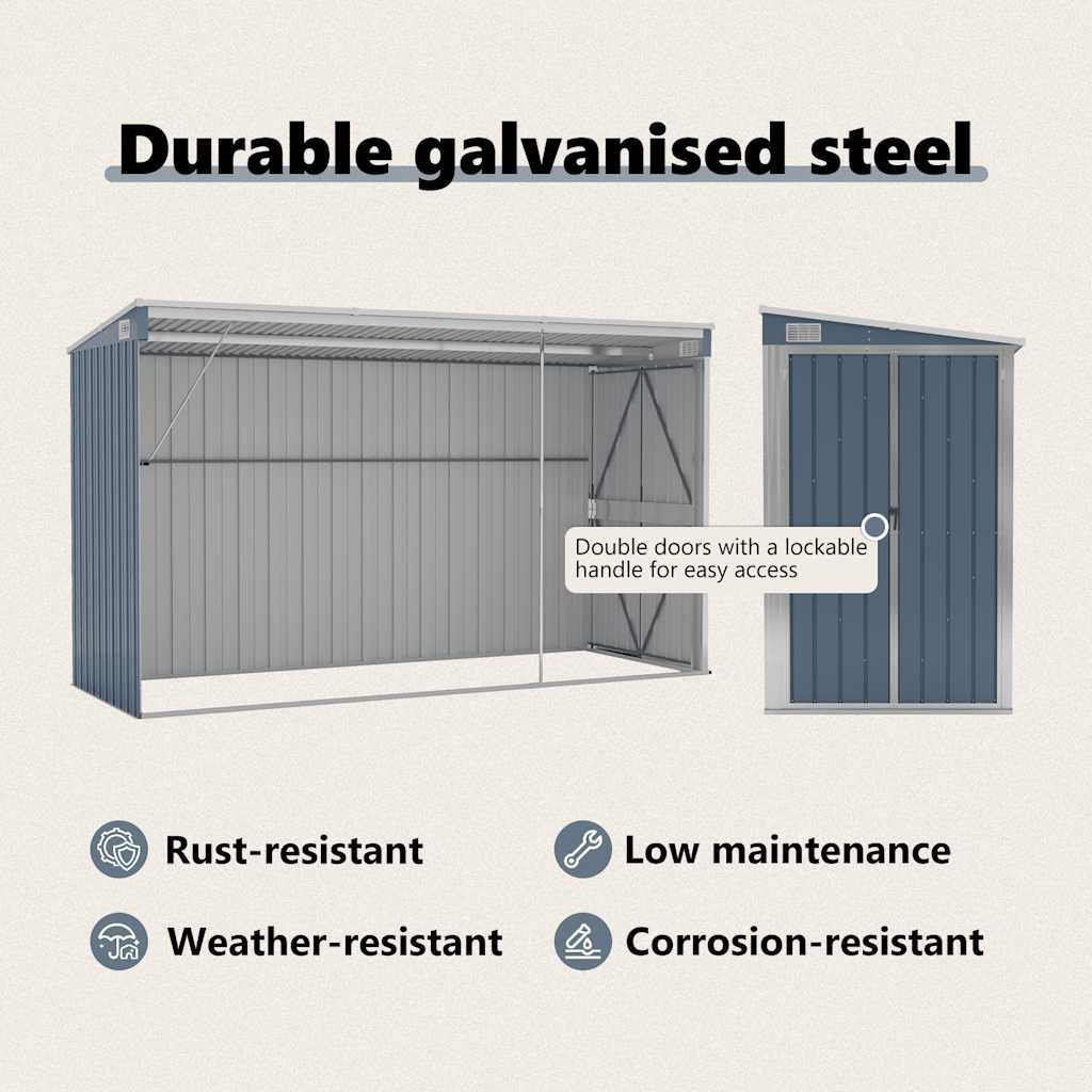 Ez a tárolófészer horganyzott acélból és fémből készült, így rendkívül tartós, valamint minimális karbantartást igényel. Az elején található kétfelé nyíló ajtók könnyű be- és kilépést biztosítanak. A zárható műanyag fogantyú gondoskodik kellékei biztonságáról. A lejtős tervezésnek köszönhetően az eső automatikusan lefolyik a fészer tetejéről.