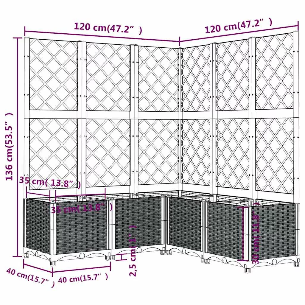 Ez az ültető időjárásálló polipropilénből készült, erős és masszív, és kültéri használatra alkalmas. Az alsó dobozban sok zöld növény és virág fér el. A beépített rács nagyszerű támaszt nyújt a kúszónövények, például a paradicsom, a borsó és a rózsa futtatásához.
