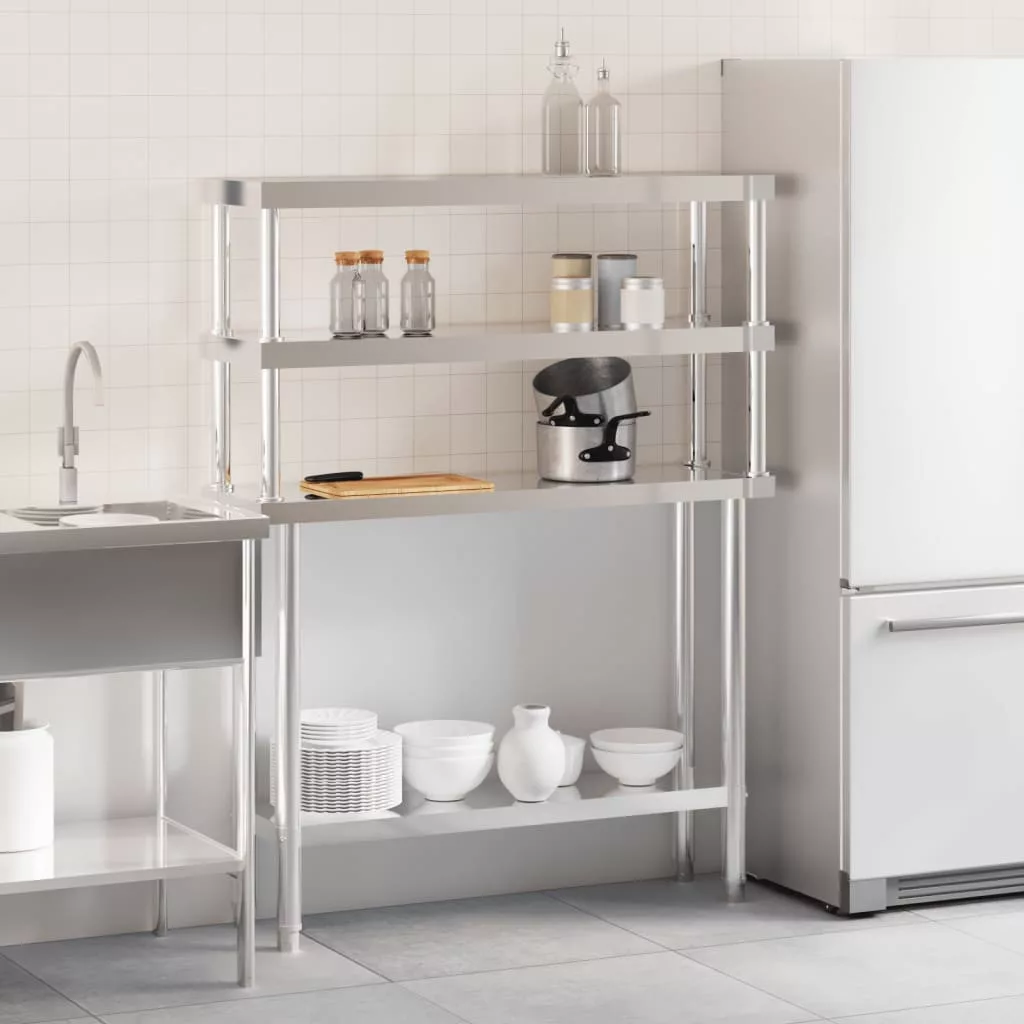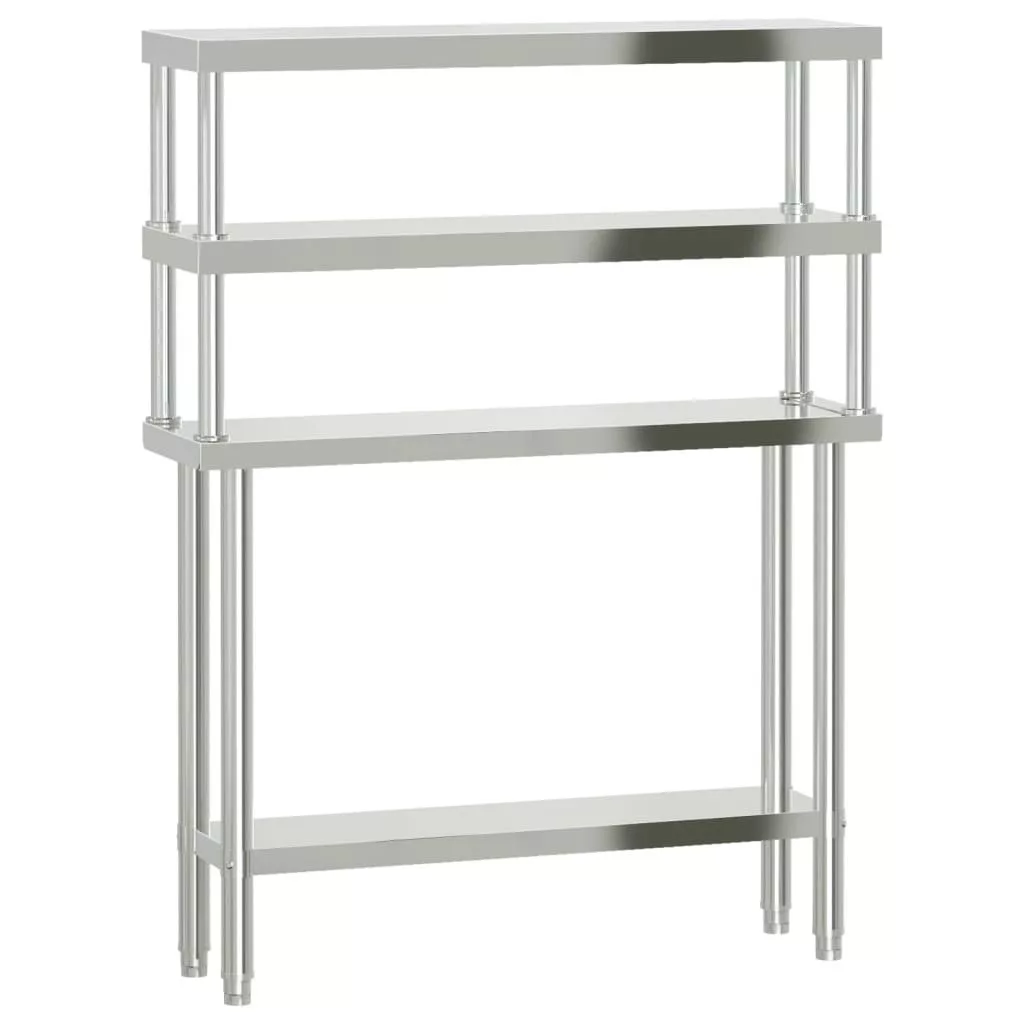 - Bőséges munkahely: A rozsdamentes acél munkaasztal alsó polccal és 2-szintes felső polccal rendelkezik a személyre szabott tárolás érdekében, bőséges tárolóhelyet biztosítva mikrohullámú sütőjének, konyhai edényeinek vagy bármilyen más eszköznek, amelyre szüksége lehet.