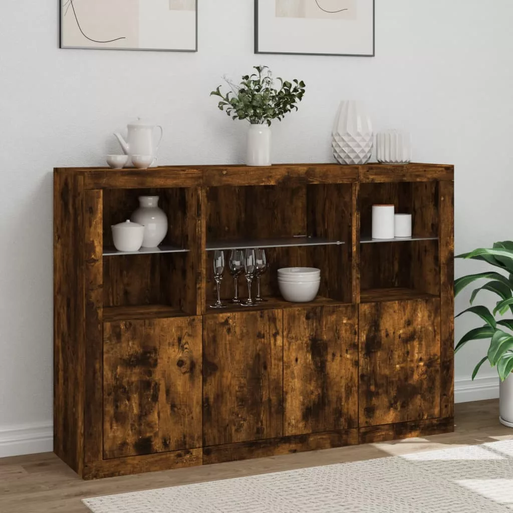 vidaXL 3 db füstös tölgy színű szerelt fa tálalószekrény LED-ekkel