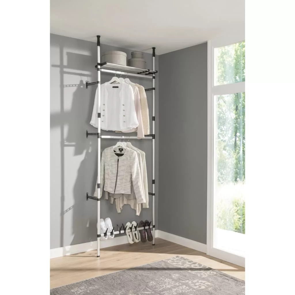 A teleszkópos szekrényrendszer alumíniumból készült, így erős és masszív. A tárolóállvány a teleszkópos rendszernek és az állítható magasságnak és szélességnek köszönhetően különböző térbeli elrendezésekhez alkalmazható. Egyedülálló és ötletes eszköz ruhatára szervezéséhez.
