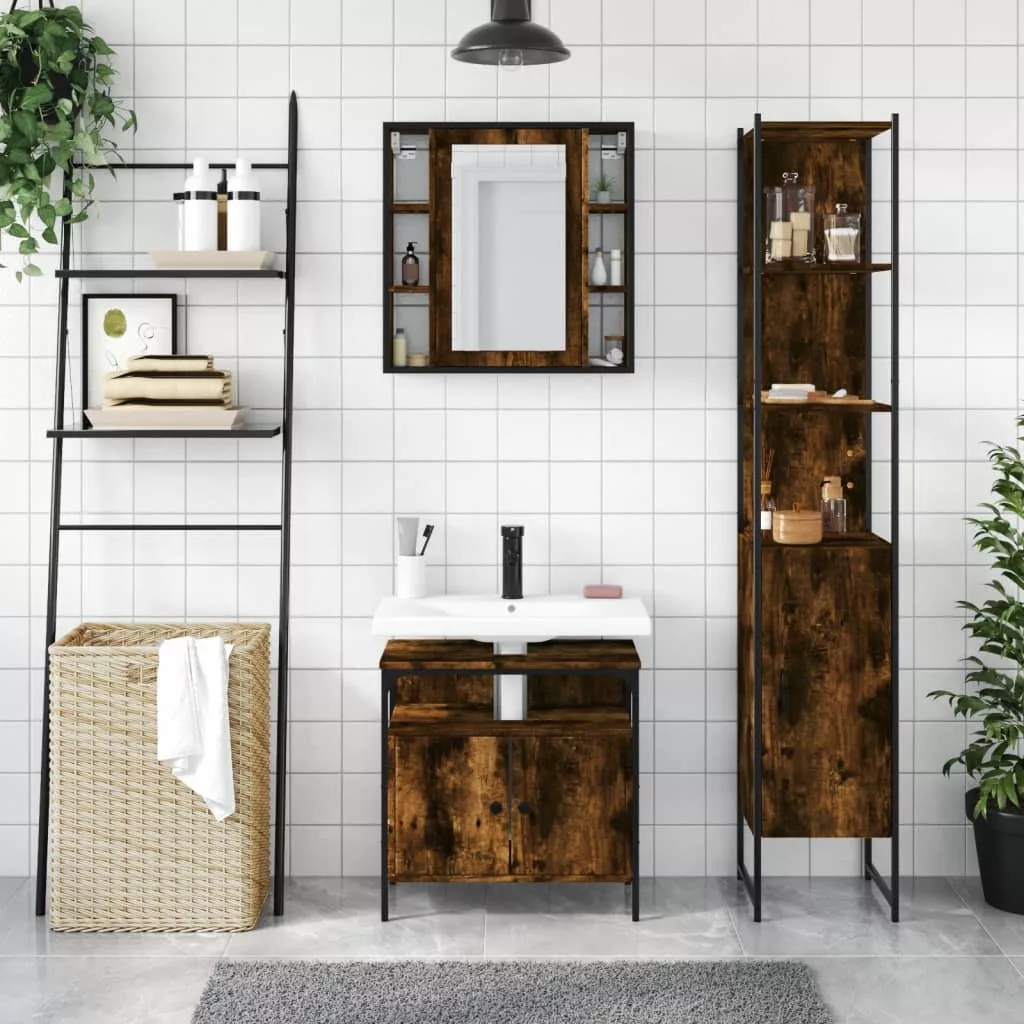 vidaXL 3 részes füstös tölgy szerelt fa fürdőszobai szekrényszett