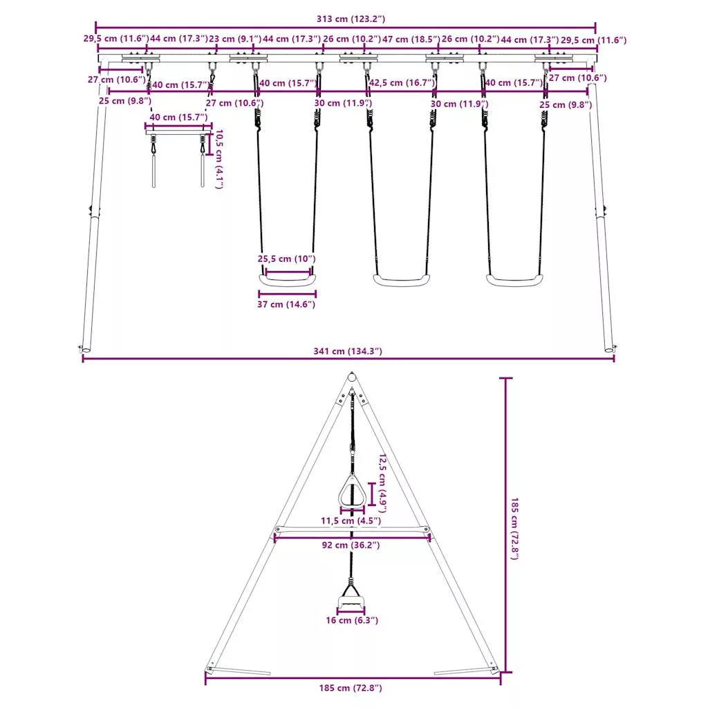 - Széleskörű felhasználás: Ez a hintaváz különféle helyeken helyezhető el, például kertben, hátsó udvaron, óvodában, játszótéren stb.