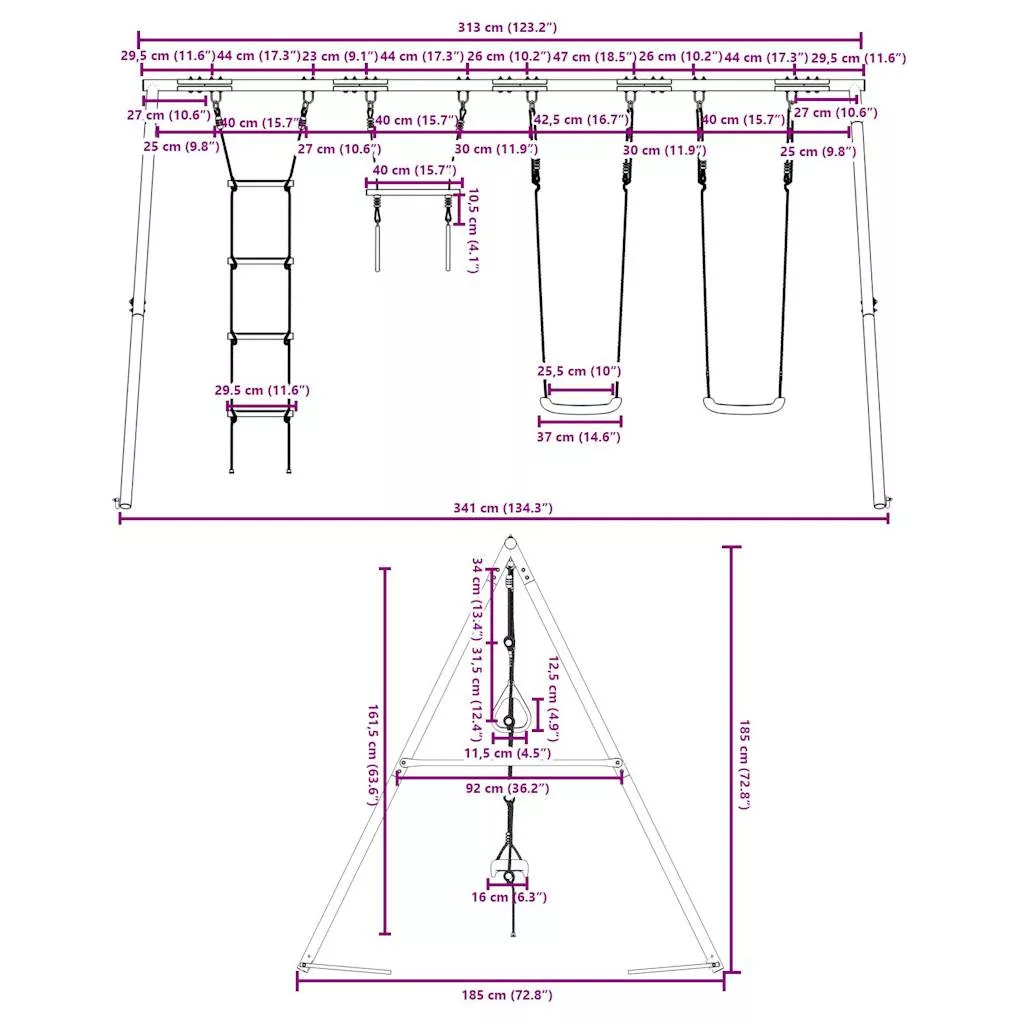 • Széleskörű felhasználás: Ez a hintaváz különféle helyeken helyezhető el, például kertben, hátsó udvaron, óvodában, játszótéren stb.