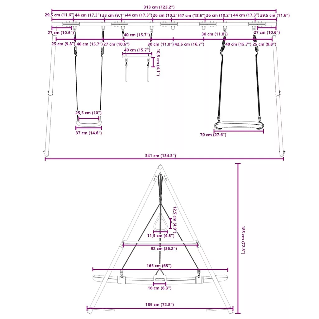 - Széleskörű felhasználás: Ez a hintaváz különféle helyeken helyezhető el, például kertben, hátsó udvaron, óvodában, játszótéren stb.