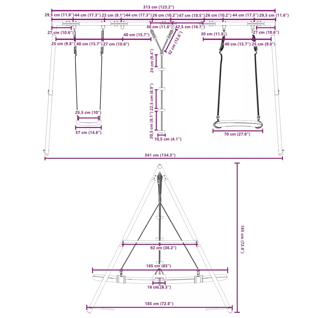 • Nagy teherbírású fém váz: Ez a hintaváz festett acélcsövekből készült, amelyek rozsdaállók, rendkívül erősek, és ellenállnak a deformációnak, kiváló stabilitást és tartósságot biztosítva. Az A-alakú szerkezet erős támaszt nyújt, ingadozás nélkül.