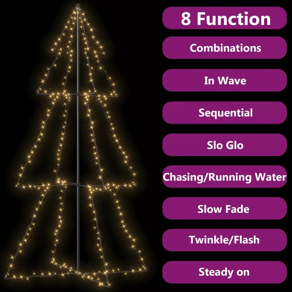 A díszvilágítás 300 nagy fényerejű LED-izzóból áll, melyek nagyon energiahatékonyak, és erős fényt bocsátanak ki. 8 különböző fényeffekttel rendelkezik: az összes effekt kombinációja, lassan izzó, villódzó/villanó, hullámzó, kergetőző/folyó víz, szekvenciális, folyamatosan bekapcsolt és lassan halványuló. Gyönyörűen világít, és varázslatos ünnepi hangulatot teremt. Igazán szemet gyönyörködtető látvány lesz, különösen este, ráadásul hangulatos háttérvilágításként is szolgál. A szabadon álló, kúp alakú fa könnyen és biztonságosan rögzíthető a talajhoz a mellékelt szerelési anyagokkal.