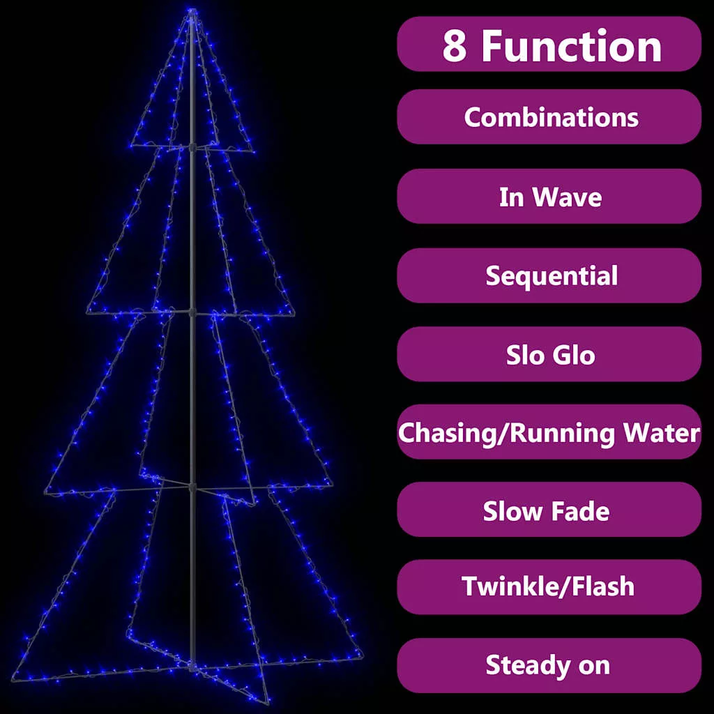 A díszvilágítás 360 nagy fényerejű LED-izzóból áll, melyek nagyon energiahatékonyak, és erős fényt bocsátanak ki. 8 különböző fényeffekttel rendelkezik: az összes effekt kombinációja, lassan izzó, villódzó/villanó, hullámzó, kergetőző/folyó víz, szekvenciális, folyamatosan bekapcsolt és lassan halványuló. Gyönyörűen világít, és varázslatos ünnepi hangulatot teremt. Igazán szemet gyönyörködtető látvány lesz, különösen este, ráadásul hangulatos háttérvilágításként is szolgál. A szabadon álló, kúp alakú fa könnyen és biztonságosan rögzíthető a talajhoz a mellékelt szerelési anyagokkal.