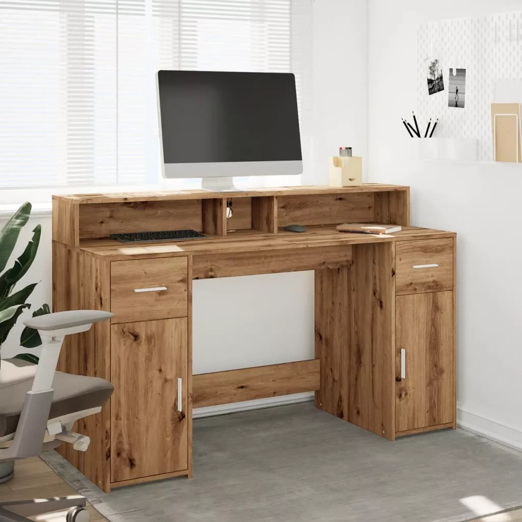 vidaXL kézműves tölgy színű szerelt fa LED-es íróasztal 140x55x91 cm