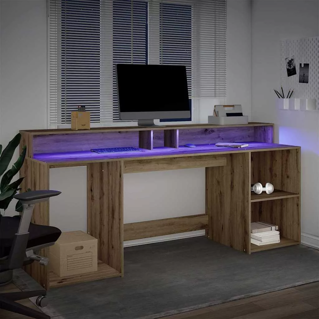 Ez a bőséges tárolóhellyel rendelkező, tartós szereketű és LED-világítással ellátott íróasztal tökéletes egy rendezett és elegáns munka- vagy játékkörnyezet kialakításához.