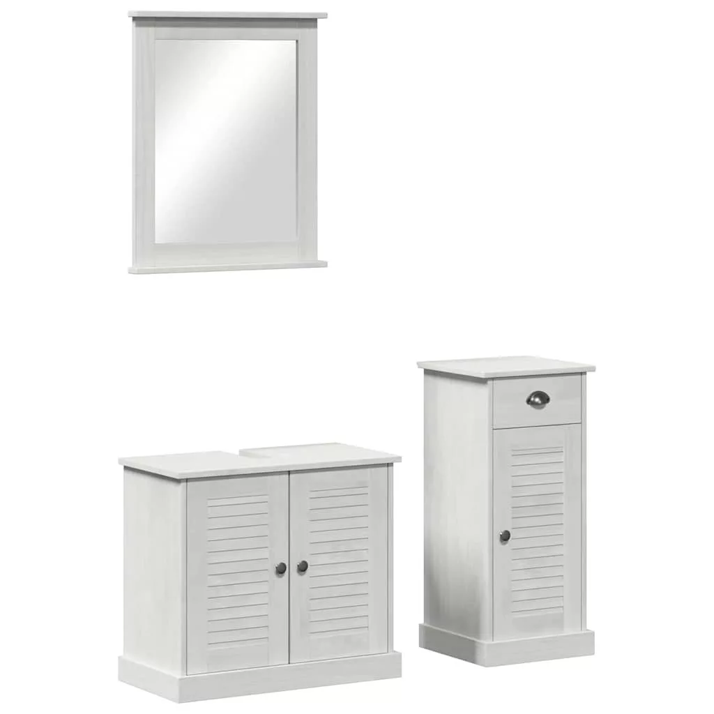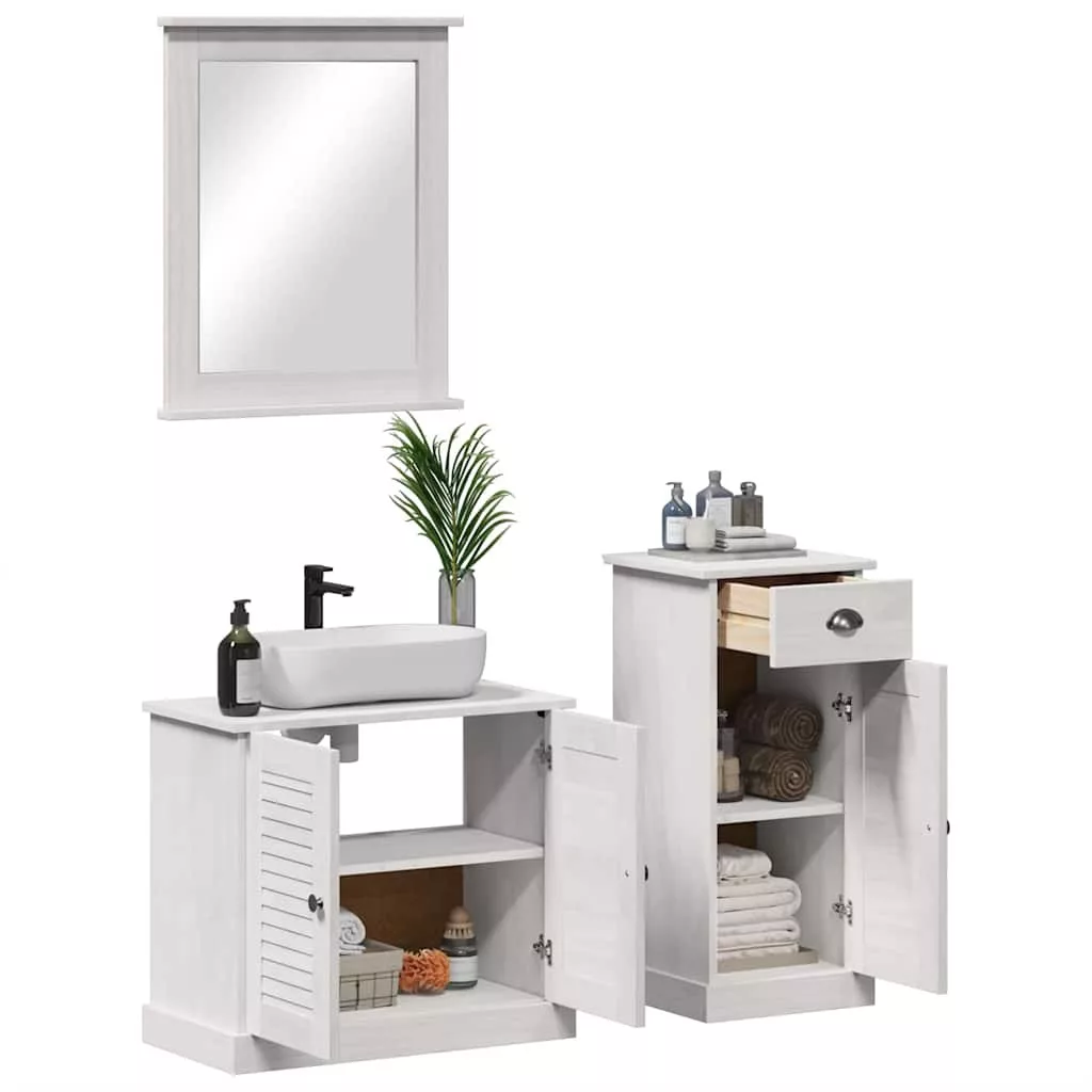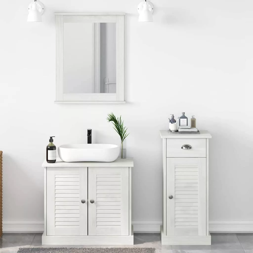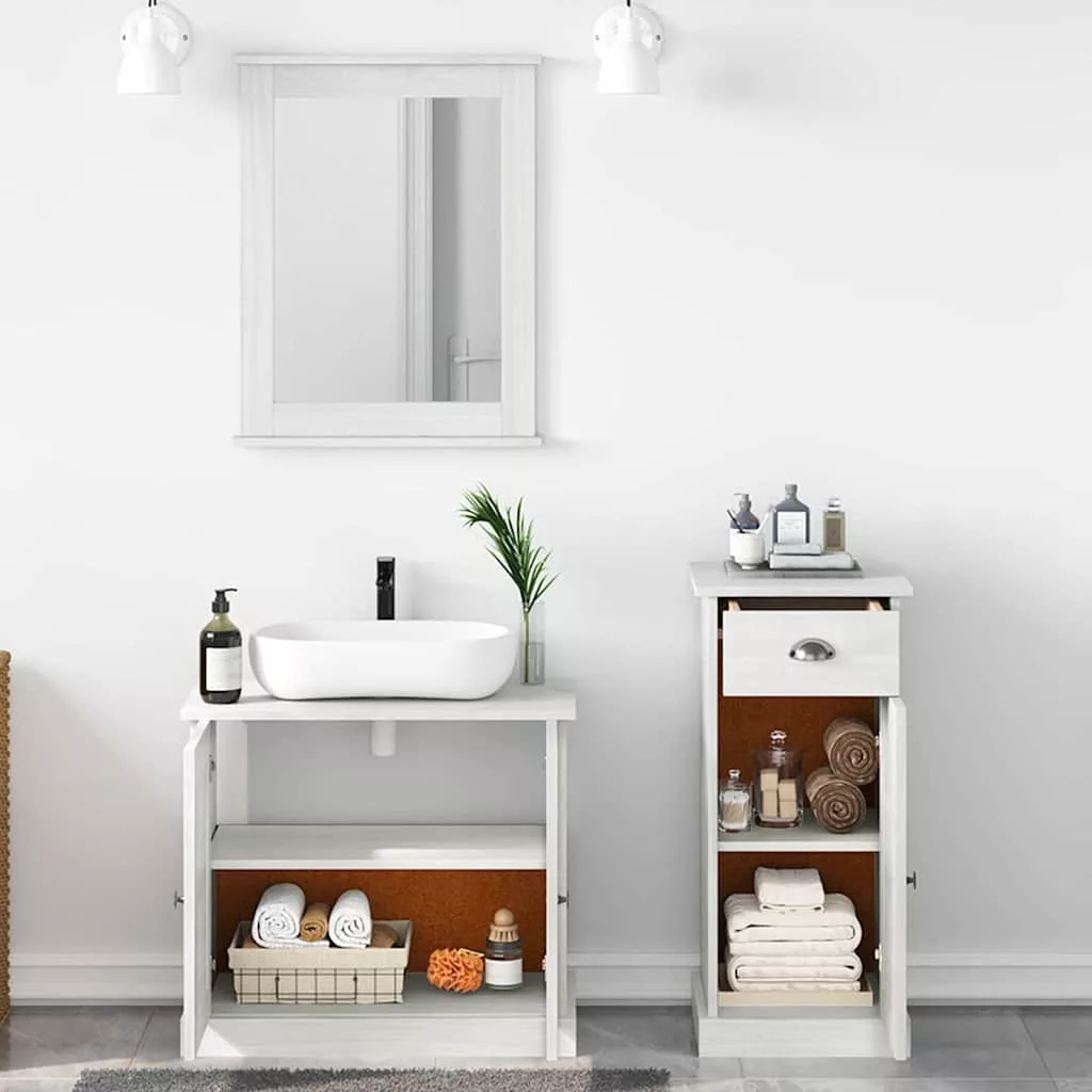 Ez a fürdőszoba bútor szett a modern dizájn és a praktikus funkcionalitás ízléses egyvelege. Tömör fenyőből készült, téglalap alakú design-ja különösen jól passzol a különböző fürdőszobákhoz. Egyszerű vonalainak és minimális díszítésének köszönhetően elegánsan nyugodt hangulatot teremt a teredben. Legyen az tárolásra vagy dekorációra használva, stílusos megjelenése és masszív felépítése bármely fürdőszoba értékes kiegészítője, fokozva a tér vizuális vonzerejét és hasznosságát.