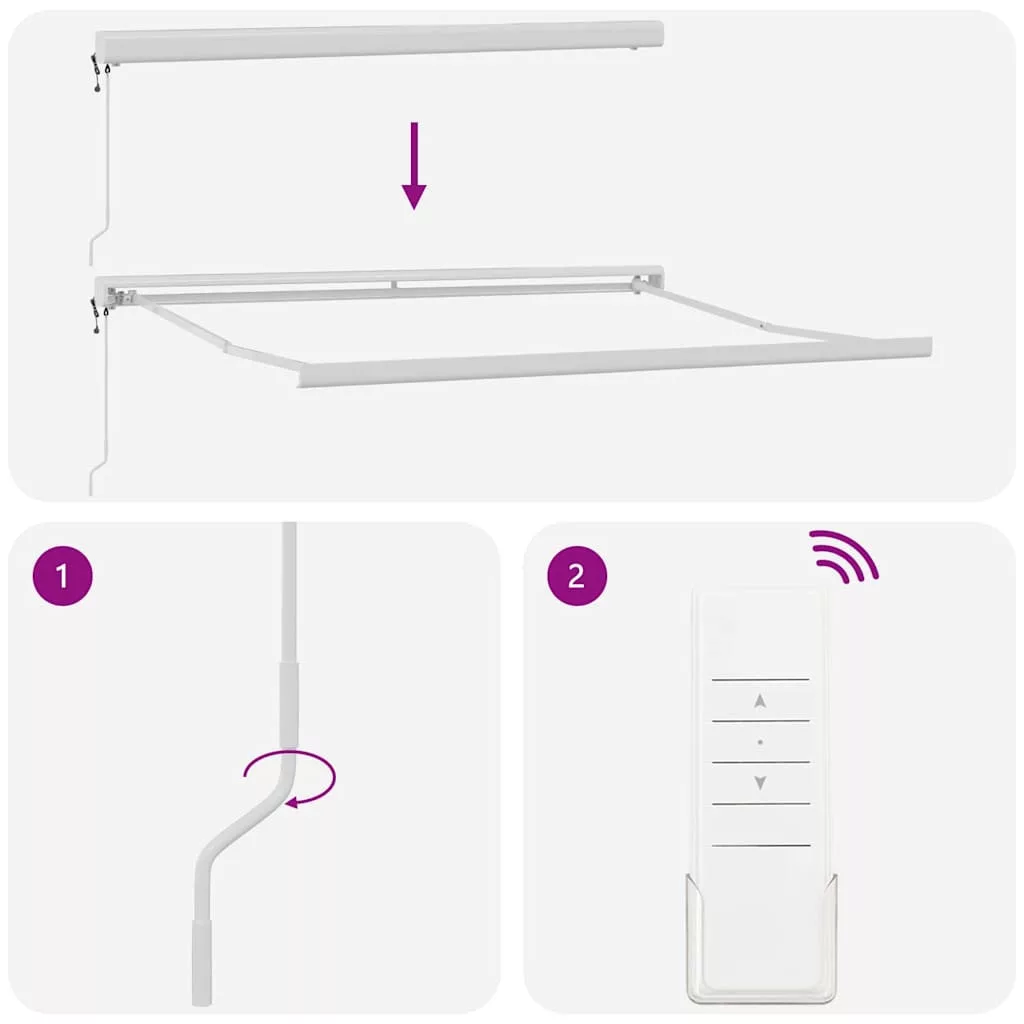 Veszély! Kinyitáskor a rugó erősen kipattan. NE távolítsa el a kötelet addig, amíg az összes összeszerelési lépést be nem fejezte, az összes csavart nem rögzítette és az elem nincs a falhoz rögzítve! Figyelem! Legyen óvatos a karok kilazításakor, mert azok feszültség alatt állnak! Az összecsukható kar hirtelen kiengedése sérülést okozhat. Figyelmeztetés: A termék használata előtt el kell olvasni a használati útmutatót. Figyelem: A fagyos körülmények között történő használat kárt tehet a termékben. Külső felhasználás épületeknél és egyéb építkezéseknél. Ne engedje, hogy a gyerekek a redőny vezérlőeszközével játszanak. Tartsa a távirányítót távol a gyermekektől.