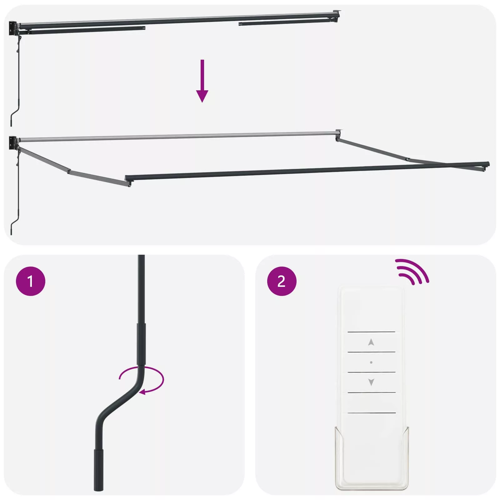 Veszély! Kinyitáskor a rugó erősen kipattan. NE távolítsa el a kötelet addig, amíg az összes összeszerelési lépést be nem fejezte, az összes csavart nem rögzítette és az elem nincs a falhoz rögzítve! Figyelem! Legyen óvatos a karok kilazításakor, mert azok feszültség alatt állnak! Az összecsukható kar hirtelen kiengedése sérülést okozhat. Figyelmeztetés: A termék használata előtt el kell olvasni a használati útmutatót. Figyelem: A fagyos körülmények között történő használat kárt tehet a termékben. Külső felhasználás épületeknél és egyéb építkezéseknél. Ne engedje, hogy a gyerekek a redőny vezérlőeszközével játszanak. Tartsa a távirányítót távol a gyermekektől.
