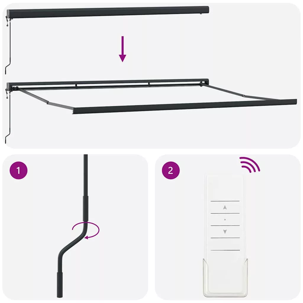 Veszély! Kinyitáskor a rugó erősen kipattan. NE távolítsa el a kötelet addig, amíg az összes összeszerelési lépést be nem fejezte, az összes csavart nem rögzítette és az elem nincs a falhoz rögzítve! Figyelem! Legyen óvatos a karok kilazításakor, mert azok feszültség alatt állnak! Az összecsukható kar hirtelen kiengedése sérülést okozhat. Figyelmeztetés: A termék használata előtt el kell olvasni a használati útmutatót. Figyelem: A fagyos körülmények között történő használat kárt tehet a termékben. Külső felhasználás épületeknél és egyéb építkezéseknél. Ne engedje, hogy a gyerekek a redőny vezérlőeszközével játszanak. Tartsa a távirányítót távol a gyermekektől.