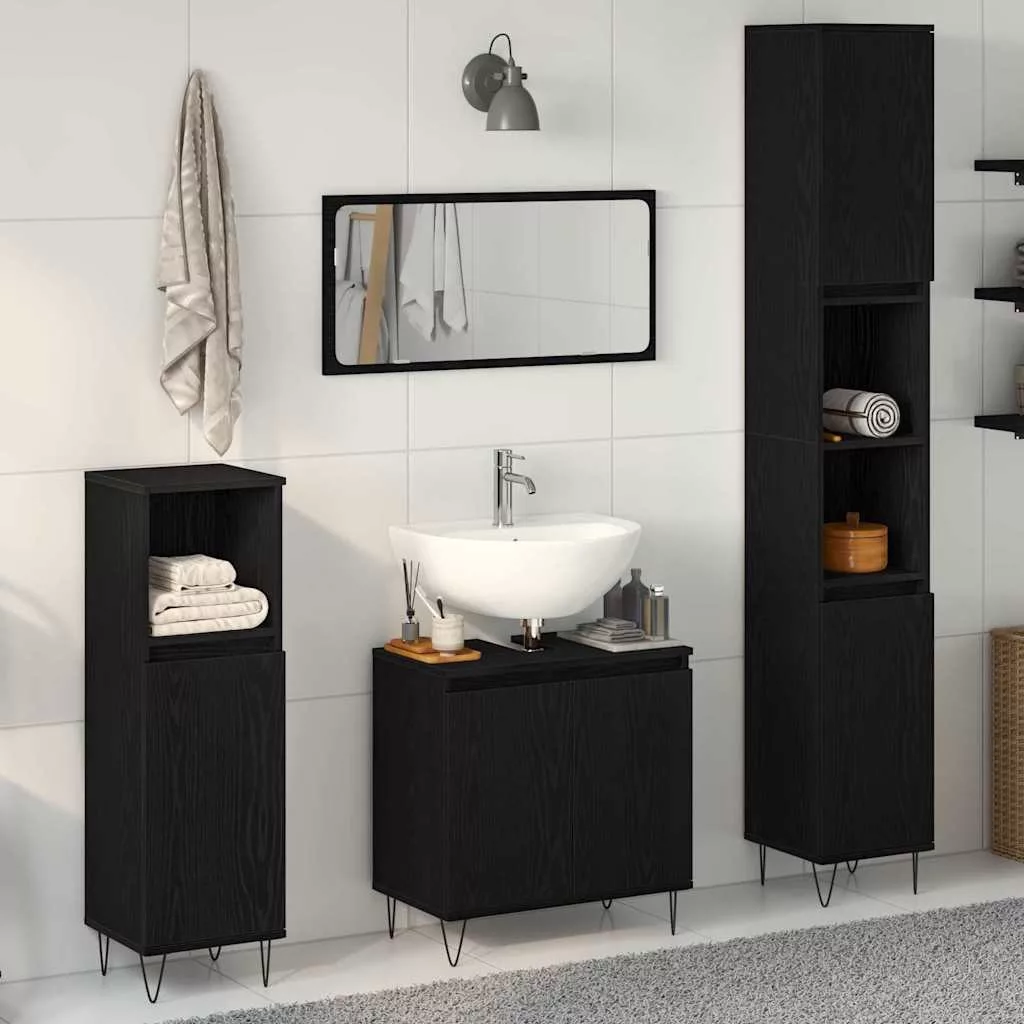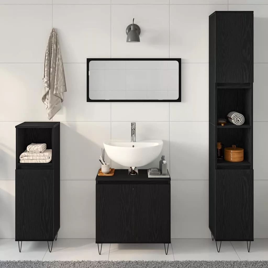 Ez a fürdőszobai bútor szett a modern esztétikát a praktikus funkciókkal ötvözi. Tökéletes a kortárs belterekhez, letisztult, minimalista dizájnja és tiszta vonalai vannak. A tartós mérnöki fából és fémből készült elemek nemcsak a fürdőszoba vizuális vonzerejét növelik, hanem bőséges tárolási lehetőségeket is kínálnak. Akár a fő hálószoba felújításáról, akár a vendégmosdó berendezéséről van szó, ez a szett simán beilleszthető bármilyen fürdőszobába.