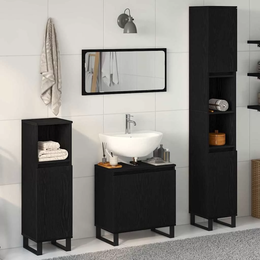 - Robusztus Szerelt Fa: Tartós dizájnnal készült, ez a bútor szett hosszú élettartamot és ellenállást nyújt a napi használat során. Szilárd kivitelezése megőrzi a bútorok kinézetét, miközben megbízható bázist biztosít a fürdőszobai alapfelszereléseknek. A szerelt fa anyag természetes hatást eredményez, ami jól beilleszkedik bármilyen fürdőszobába.