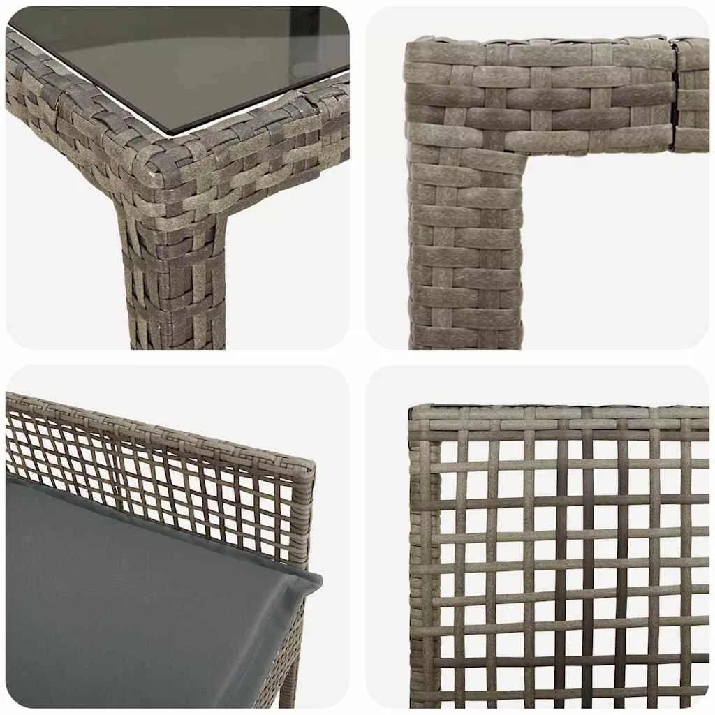 - Csatlakozó elemek: Poliészter párnákkal felszerelt az étkező szett, amik kényelmet és könnyű karbantartást kínálnak. A poli rattan háttámlák, karfák és a keret stabil támogatást nyújtanak és letisztult megjelenést adnak. A cipzáras bélés segít a párnák egyszerű eltávolításában és tisztításában.