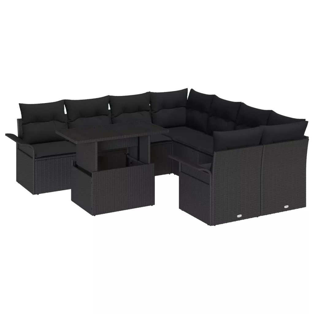 vidaXL 9 Darabos Kerti Kanapé Szett Párnákkal Fekete Polirattan