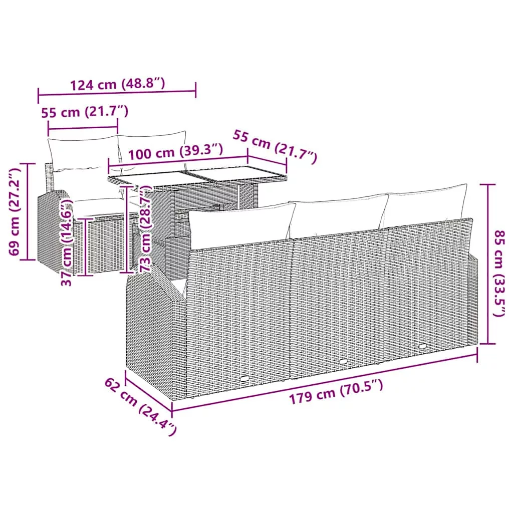 - 1 x Középső ülés: 55x62x85 cm (HxSzX) ,4 x Karfás kanapé: 55x62x85 cm (HxSzX) ,1 x Asztal: 100x55x73 cm (HxSzX)
