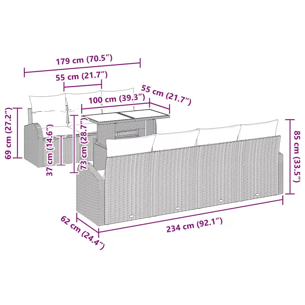 - Teljesítményes alkatrészek A készlet három középső ülőhellyel, négy karfás kanapéval és egy asztallal van felszerelve, mindez kényelmes párnákkal. Minden elemnek megvan a maga funkciója, hogy a lehető legjobban támogassa a pihenést. Az acélváz és a poli rattan burkolat biztosítja a stabilitást, míg az edzett üveg asztallap simán tisztítható, így egyszerű a karbantartása.