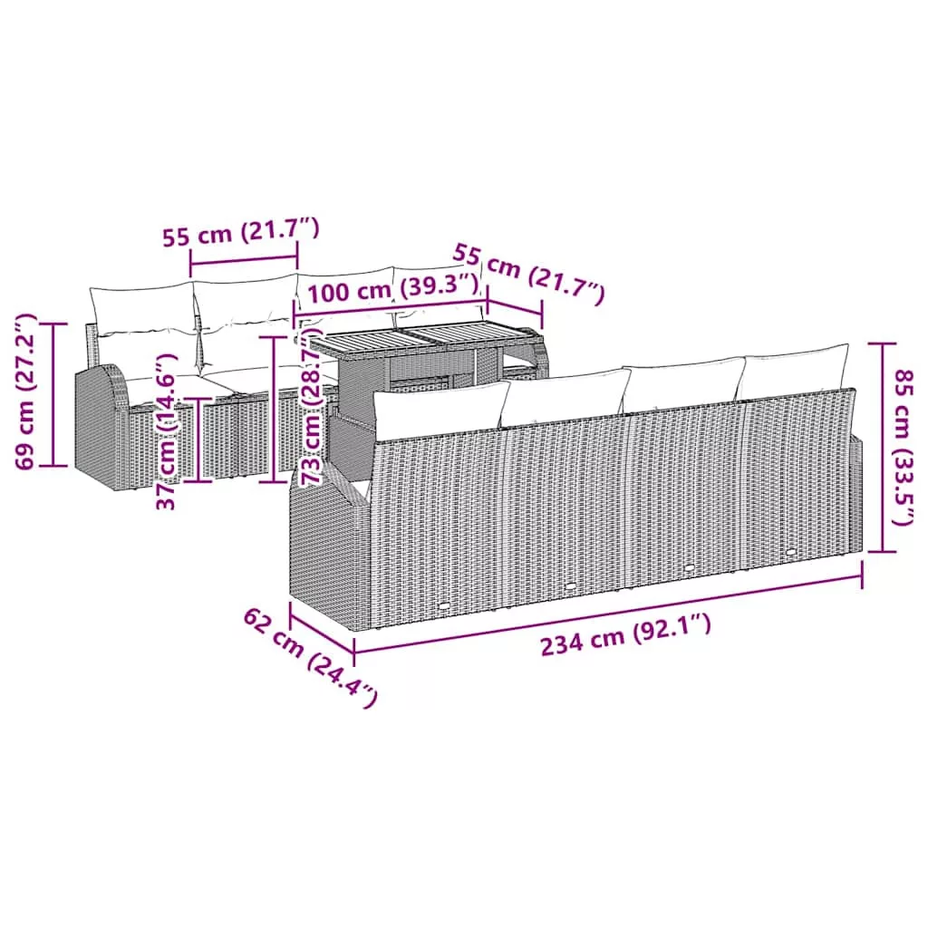 - Teljes komponensek: Két, 2 személyes kanapét kapsz, mindegyik polirattan karfával, plusz négy középső üléstárolóval. Van egy nagy asztal is, ami bőven elegendő helyet biztosít az étkezési kellékeidnek.