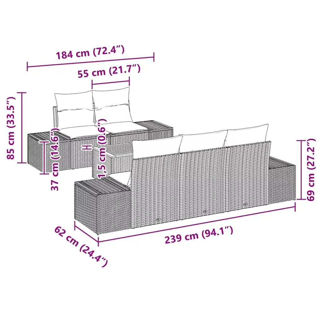 - Tartalmazott alkatrészek: A szett bőséges ülőhelyet és egy kerti asztalt tartalmaz. Van benne egy középső ülőfelület 55 x 62 x 69 cm-es, négy oldalsó kanapé 92 x 62 x 69 cm-es, és egy 55 x 55 x 37 cm-es kerti asztal. Minden alkatrész hozzájárul a szett funkcionalitásához és vizuális vonzerejéhez.