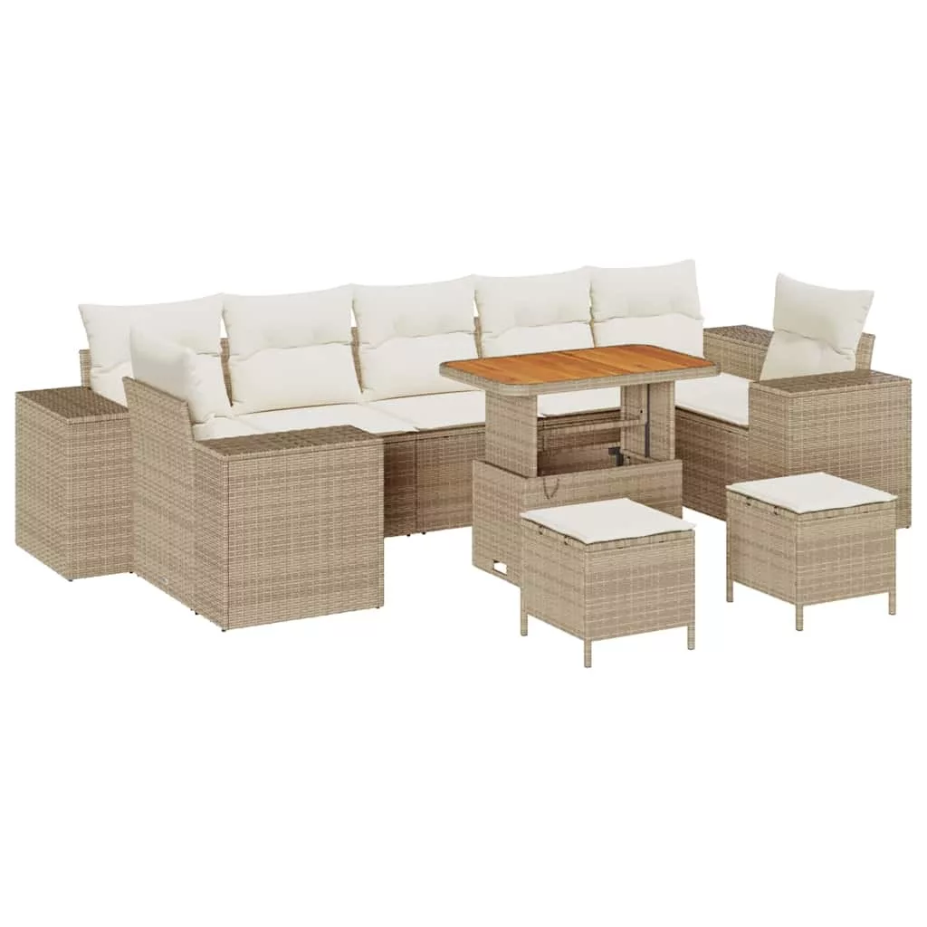 - Beépített elemek: A szett négy karfás kanapét és három középső ülést tartalmaz, mindegyik széles kartámaszokkal az üdítők elhelyezésére. A polirattan háttámla támaszt nyújt, míg a poliészter párnák kényelmesek. Egy magasságban állítható asztal könnyen átalakulhat kávézó- vagy étkezőasztallá, a puffok pedig extra ülést kínálnak.