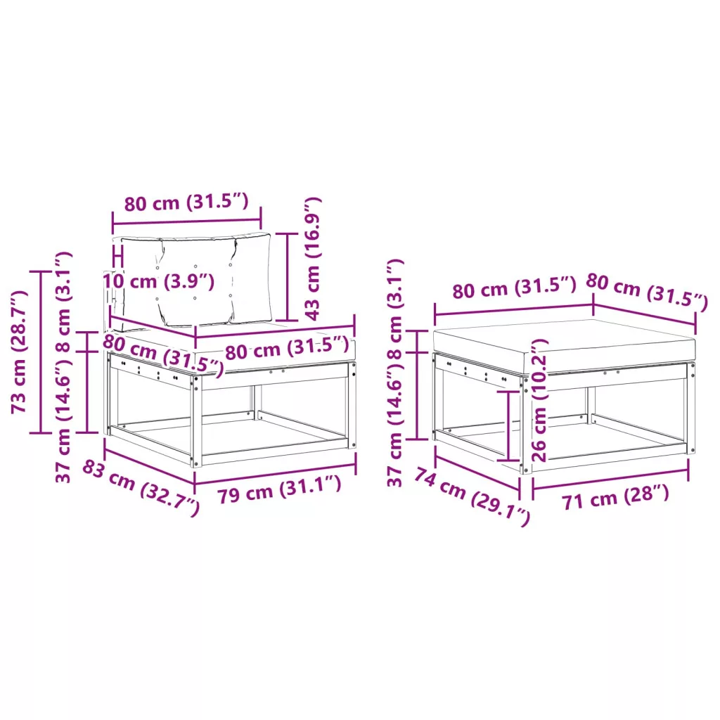 • 3 x Középső kanapé: 79 x 83 x 73 cm (H x Sz x M)
