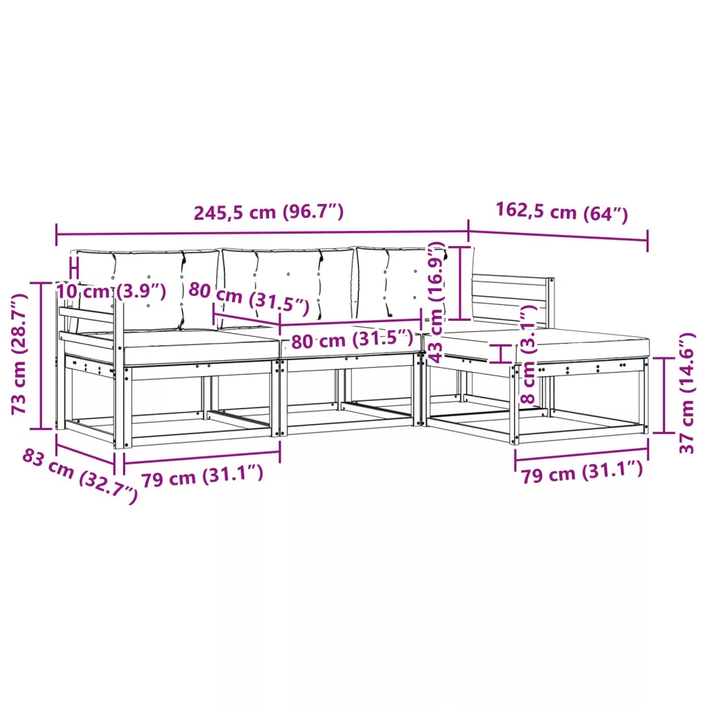 - 3 x Középső kanapé: 79 x 83 x 73 cm (H x Sz x M)