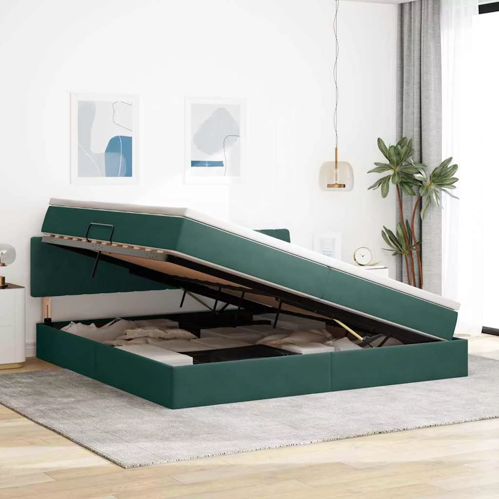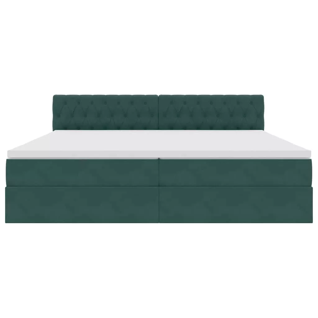 vidaXL Ágy tárolóval és LED lámpával Sötétzöld 200 x 200 cm Bársony