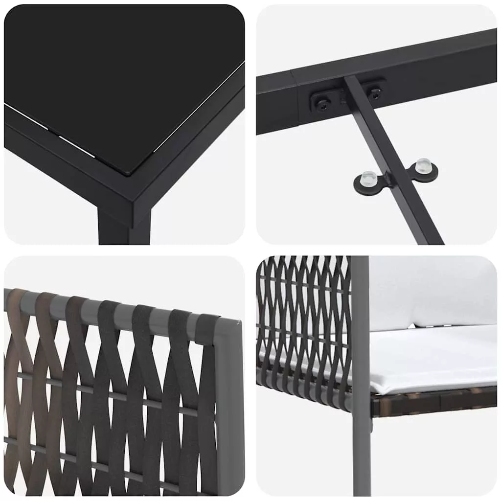 - Tartós anyagok: A Modern Kerti Étkező Szett polirattan és porszórt acél felhasználásával készült, így tartós és hosszú távú megoldás a megjelenés és a tartósság szempontjából. A polirattan gyorsan szárad és időjárásálló, így nem deformálódik vagy penészesedik a hirtelen esőzések során. A porszórt acél masszív tartása védi a bútort az aktuális évszakok kihívásaival szemben.