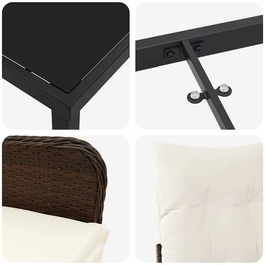 - Magas színvonalú anyagok: A poly rattan, edzett üveg és porbevonatos acél szuper tartós és elegáns étkező szettet hoz össze. A poly rattan nemcsak szép, hanem UV-álló is, így sokáig használható. A porbevonatos acél erős alapot nyújt, ami jól bírja a szabadtéri körülményeket.